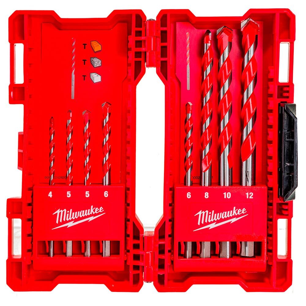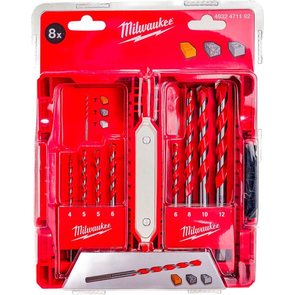 Набор сверл по бетону Milwaukee Премиум 4-12мм 8шт ударные (4932471192) с наконечниками из карбида вольфрама (TCT) позволяют сверлить бетон, газобетонные блоки, каменную кладку, шифер и гранит. Начиная с диаметра 5мм на хвостовиках сверл имеются 3 грани для предотвращения проворачивания в патроне. У сверл диаметром 3 и 4мм хвостовик круглый. Может использоваться как с ударом, так и без.