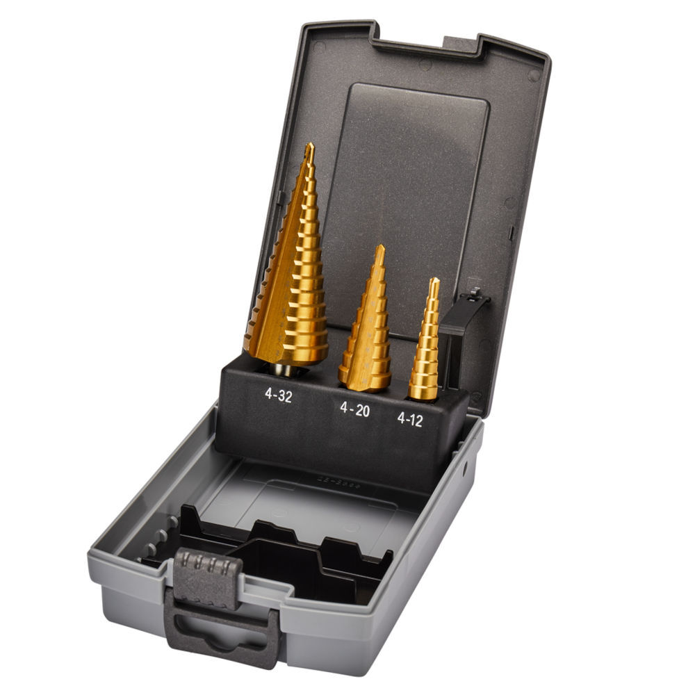 Набор сверл по металлу Makita HSS-TiN 4-32мм ступенчатые 3шт (D-46573) с прямым желобком и титановым покрытием предназначен для сверления отверстий различного диаметра в листовом металле и в цветных металлах. Набор состоит из 3 ступенчатых сверл (4-12мм, 4-20мм, 4-32мм). Сверла имеют длительный срок службы.