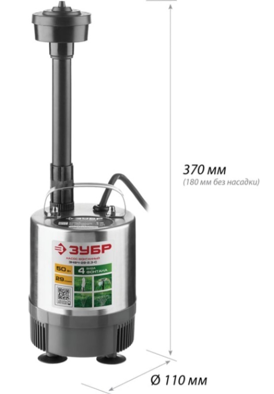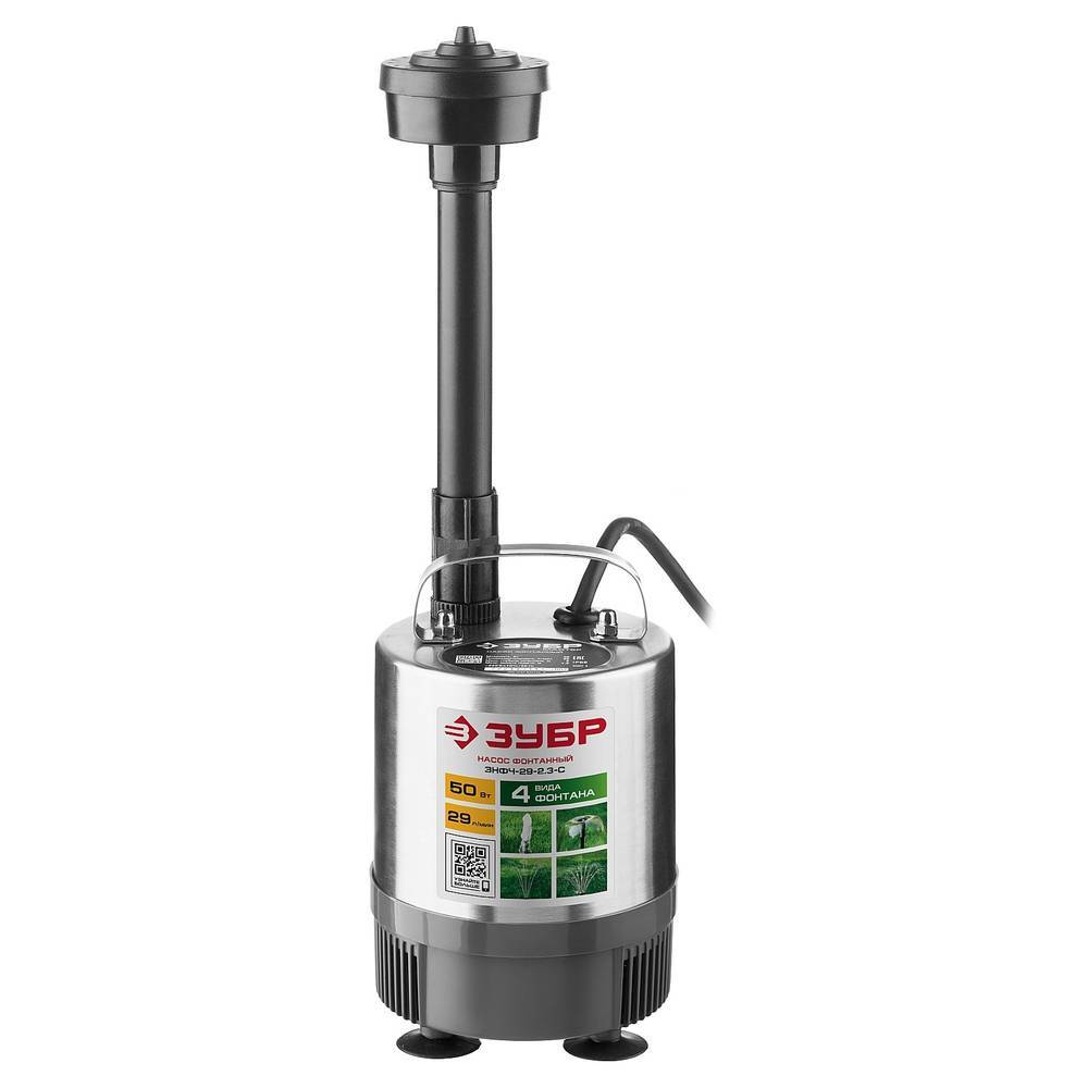 Насос фонтанный ЗУБР ЗНФЧ-29-2.3-С с корпусом из нержавеющей стали используется для украшения водоемов фонтаном с различными типами струй, а также водопадом. Также может использоваться для перекачки чистой воды из водоемов с учетом технических характеристик модели. Обычный пруд с установкой насоса превращается в фонтан, причем, благодаря сменным насадкам, форма струи легко меняется между ″гейзером″, ″каскадом″ и ″колокольчиком″, а также может переключаться на водопад. Таким образом, одно изделие способно изменить Ваш пруд или сад, привнеся в него веселое и успокаивающее журчание воды, под которое так приятно отдыхать после рабочей недели.
