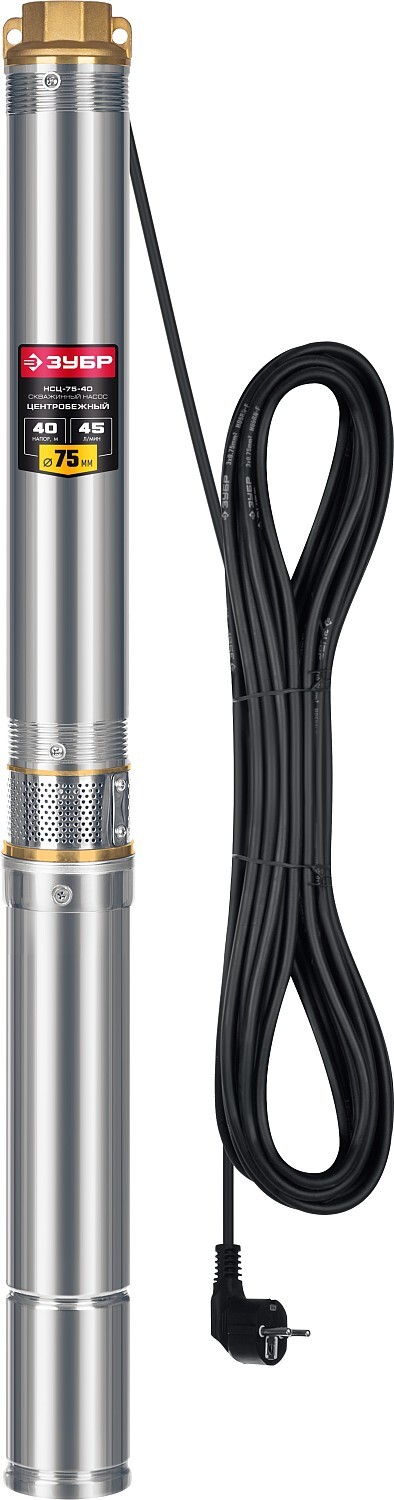 Центробежный скважинный насос ЗУБР НСЦ-75-40 — компактное решение для стабильного водоснабжения дома и полива участка. Обеспечивает подачу чистой воды с глубины до 40 м из скважин, колодцев и водоемов. Прочный корпус из нержавеющей стали защищен от коррозии, проушины для троса упрощают безопасное погружение, а «плавающие» рабочие колеса позволяют работать с водой, содержащей песок (до 180 г/м³).