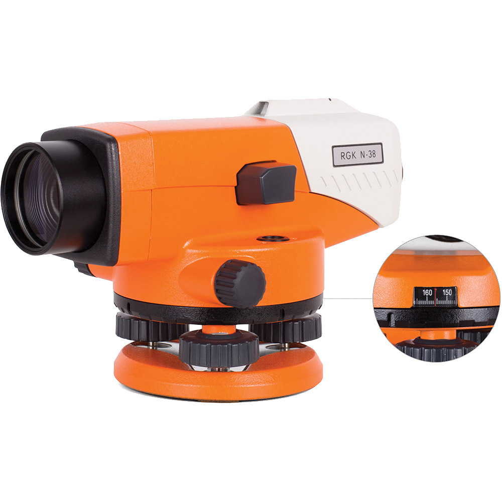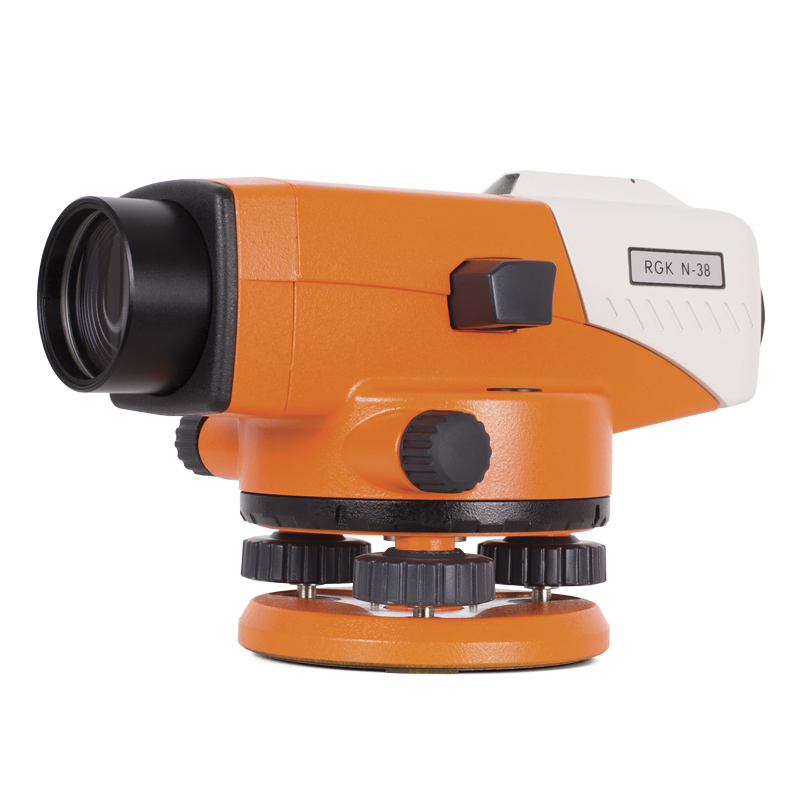 RGK N-38 – оптический нивелир, со средней квадратической ошибкой на километр двойного хода 0,7 мм – этой точности будет достаточно для проведения работ, требующих повышенной точности, включая нивелирование III и IV класса, маркшейдерские, строительные и многие другие задачи. Оптическая система обеспечивает прямое изображение с увеличением в 38 раз, а минимальное фокусное расстояние составляет 30 см. Прибор подходит для работы на любых объектах – от строительных площадок до тоннелей и шахт, как на больших, так и на малых дистанциях. Высокая точность оптики нивелира усилена использованием компенсатора с магнитным демпфером. Система компенсации устраняет отклонение по горизонтали в пределах 15’ с точностью 0,2’, благодаря чему RGK N-38 обеспечивает стабильное изображение в зрительной трубе. Для первоначальной установки нивелира в горизонтальное положение используются плавные наводящие винты, а контроль горизонта производится с помощью встроенного пузырькового уровня прибора.