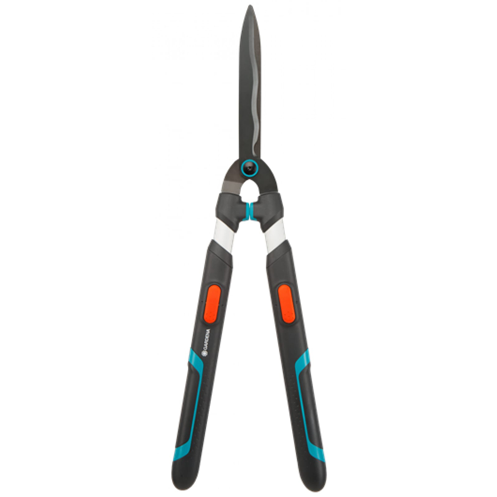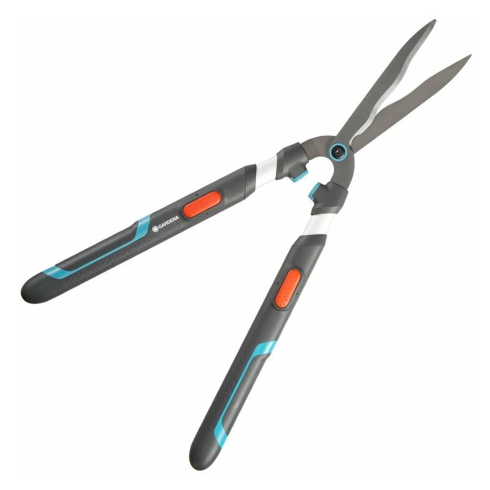 Ножницы Gardena для живой изгороди - благодаря выдвижным телескопическим рукояткам TeleCut вы можете увеличить радиус действия на 20см. Лезвия выполнены из нержавеющей стали и имеют волнообразную форму для стрижки длинных живых изгородей. Мягкий буфер на рукояти снижает нагрузку на руки пользователя.