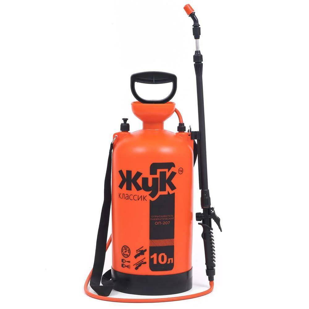 Опрыскиватель ЖУК Классик ОП-207 10л с цельной заливной воронкой, с брандспойтом и наплечным ремнём. Используется для опрыскивания, подкормки и полива растений, кустарников, деревьев средней высоты, картофеля, а также для мытья стен, стекол и других хозяйственных работ. Бак с цельнолитой заливной воронкой, что не требует дополнительного уплотнения для насоса опрыскивателя к воронке. Регулировка струи на брандспойте даёт возможность использовать опрыскиватель как для защиты растений от вредителей, так и для полива (от струи до тумана).