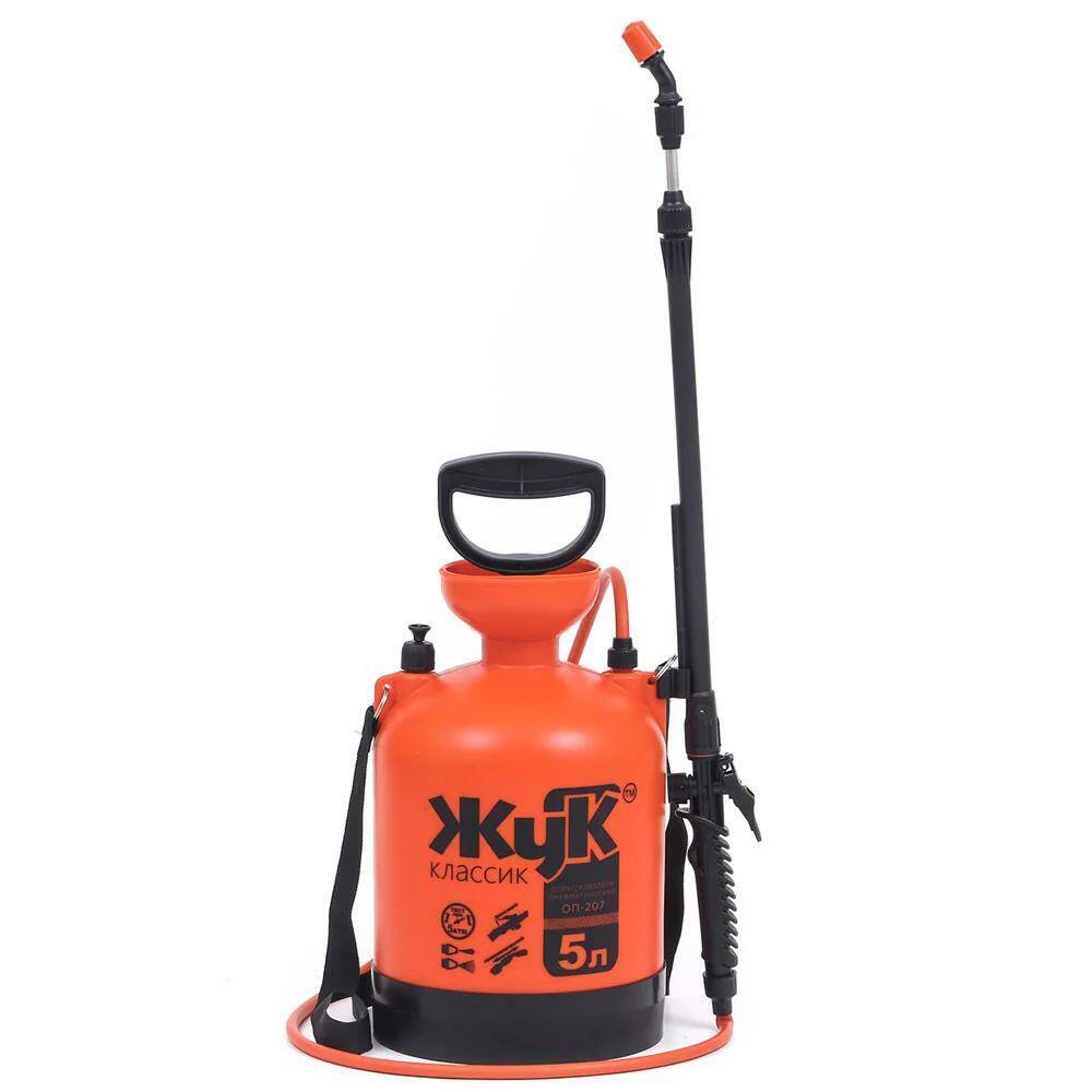 Опрыскиватель ЖУК Классик ОП-207 5л с цельной заливной воронкой, с брандспойтом и наплечным ремнём. Используется для опрыскивания, подкормки и полива растений, кустарников, деревьев средней высоты, картофеля, а также для мытья стен, стекол и других хозяйственных работ. Бак с цельнолитой заливной воронкой, что не требует дополнительного уплотнения для насоса опрыскивателя к воронке. Регулировка струи на брандспойте даёт возможность использовать опрыскиватель как для защиты растений от вредителей, так и для полива (от струи до тумана).