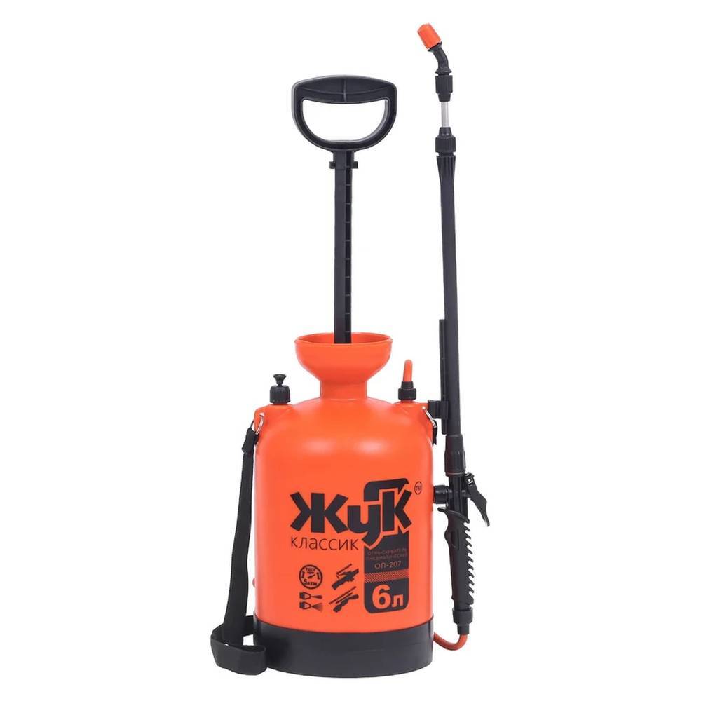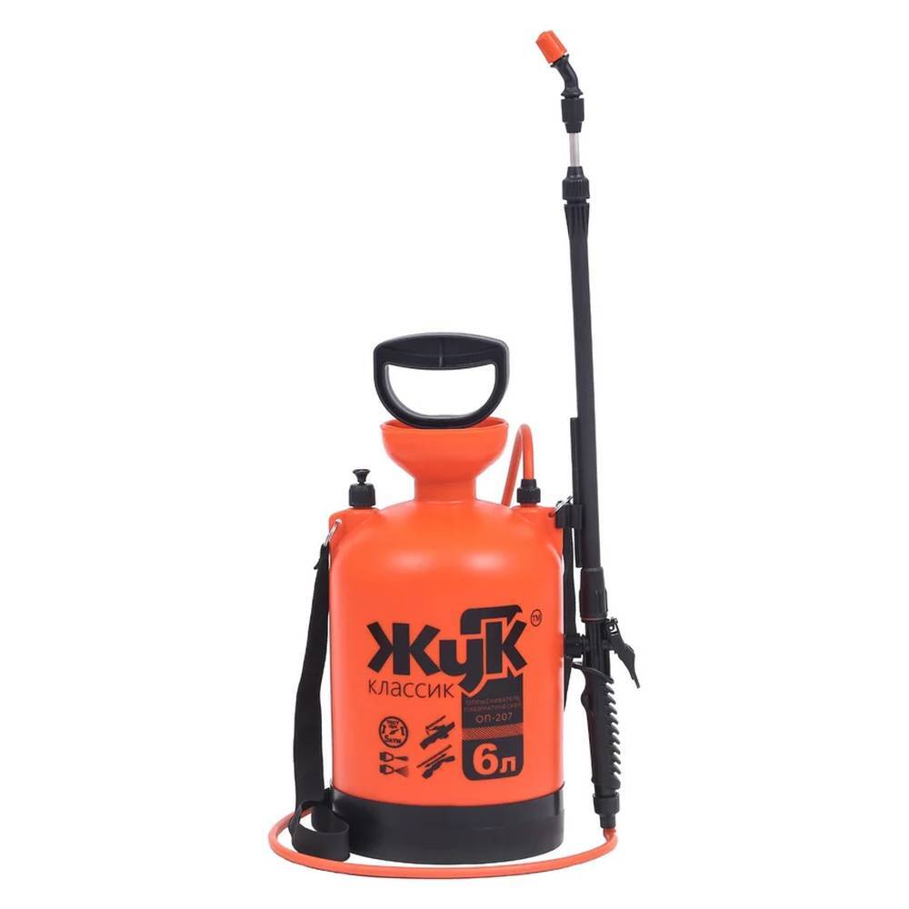 Опрыскиватель Жук Классик ОП-207 6л используется для опрыскивания, подкормки и полива растений, кустарников, деревьев средней высоты, картофеля, а также для мытья стен, стекол и других хозяйственных работ.