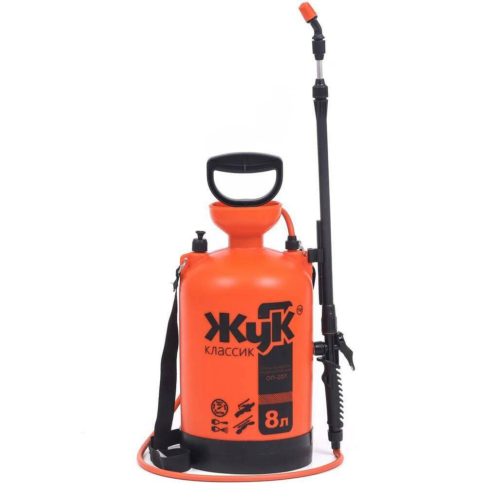 Опрыскиватель ЖУК Классик ОП-207 8л с цельной заливной воронкой, с брандспойтом и наплечным ремнём. Используется для опрыскивания, подкормки и полива растений, кустарников, деревьев средней высоты, картофеля, а также для мытья стен, стекол и других хозяйственных работ. Бак с цельнолитой заливной воронкой, что не требует дополнительного уплотнения для насоса опрыскивателя к воронке. Регулировка струи на брандспойте даёт возможность использовать опрыскиватель как для защиты растений от вредителей, так и для полива (от струи до тумана).