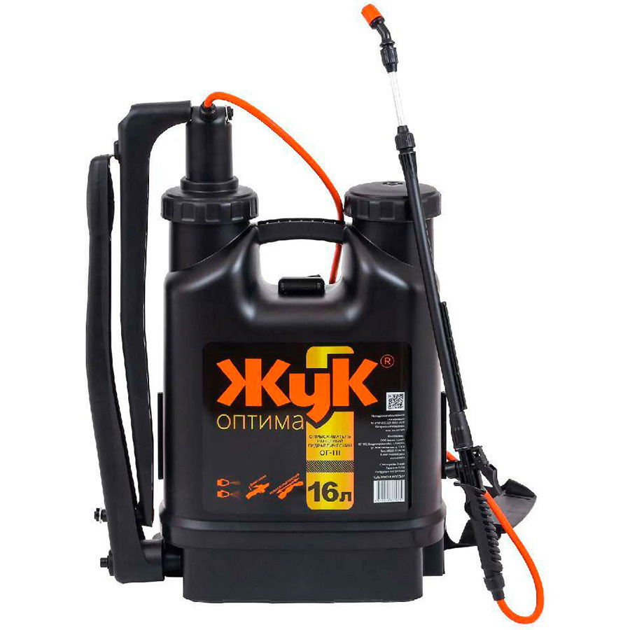 Опрыскиватель ЖУК Оптима ОГ-111 16л для обработки больших садовых участков. Используется для опрыскивания, подкормки и полива растений, кустарников, деревьев, картофеля, а также для мытья стен, стекол и других хозяйственных работ. Плечевые ремни, с регулируемой длиной, обеспечивают разгрузку спины при работе. Радиус действия до 1680мм обеспечивается за счет использования телескопического брандспойта с регулируемым наконечником. Широкая горловина с фильтром, что удобно при использовании сухих препаратов, предварительно разведённые водой, которые нужно процедить перед опрыскиванием. Пластиковый карман на баке для размещения брандспойта. Агрегат можно переоборудовать под работу как правой, так и левой рукой.