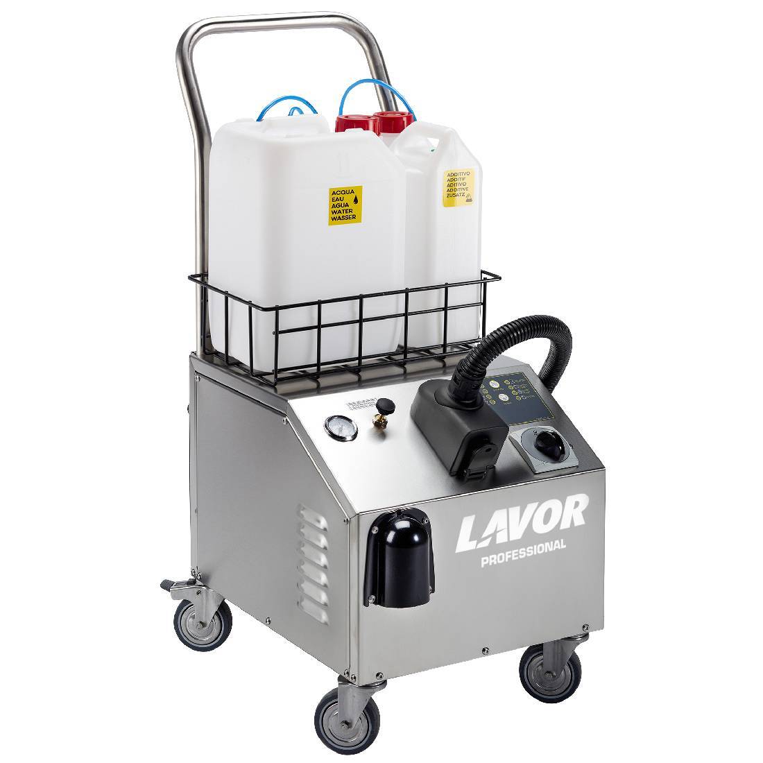 Для обработки может использоваться водяной пар, подающийся под высоким давлением до 9 бар, а также пена из раствора моющего средства. Парогенератор для клининга Lavor Pro GV 8T Plus работает от сети с напряжением 400 В и имеет большую мощность бойлера (8000 Вт), что позволяет переводить воду в состояние пара за 6 минут.