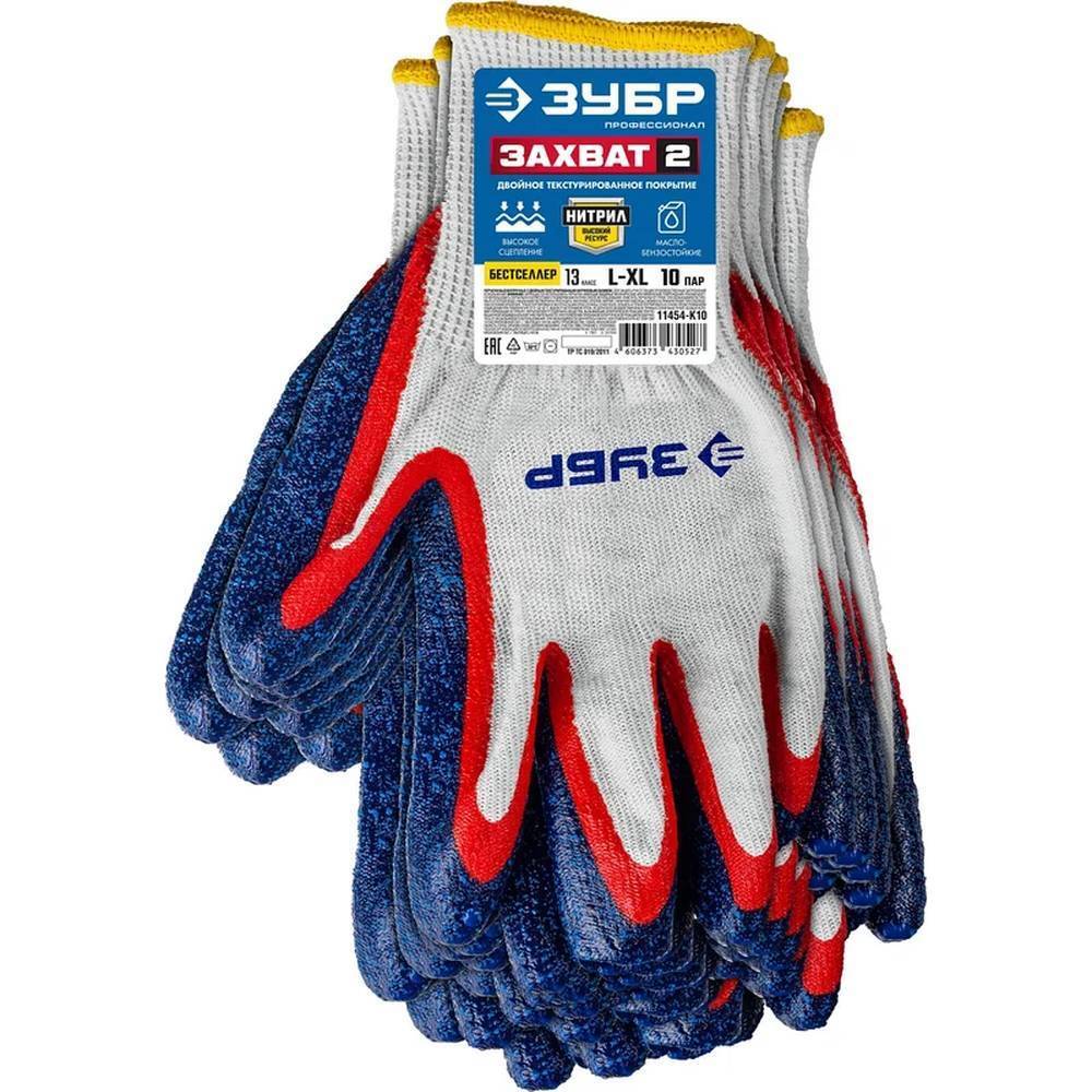 Перчатки ЗУбР ЗАХВАТ-2 х/б с двойным текстурированным нитриловым обливом L-XL 10пар 11454-K10 незаменимы при строительстве, сельскохозяйственных работах, на химических производствах. Они защищают руки от механических, химических и термических повреждений, грязи и брызг металла. Рабочие перчатки ″ЗУБР″ с двойным обливом ладони предназначены для защиты от общих производственных загрязнений и скольжения. Тыльная сторона таких перчаток выполнена без покрытия, что обеспечивает постоянный приток воздуха.
