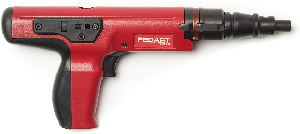 Монтажный пороховой полуавтоматический пистолет FEDAST 301R предназначен для пристрелки различного крепежа, такого как дюбели одиночные разных модификаций (PD, YD, PS, DN), дюбели с шайбой (DNW, PJ, YJ), дюбели с наружной резьбой (M6, M8), дюбели для монтажа профлиста (ENP8) и различный металлический крепеж для инженерных систем (JP, PK и пр.).