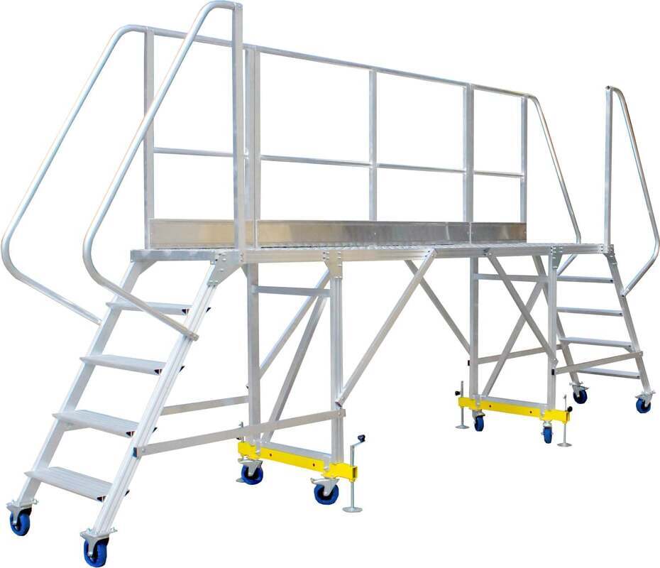 Площадка авиационная алюминиевая MEGAL ПАА - 2,1 х 3,5 х ВО с двухсторонним подъемом предназначена для размещения рабочих и материалов в зоне проведения работ внутри или вне помещения. Для безопасного подъема/спуска и проведения работ площадка и лестничный марш оборудованы перилами-ограждениями.