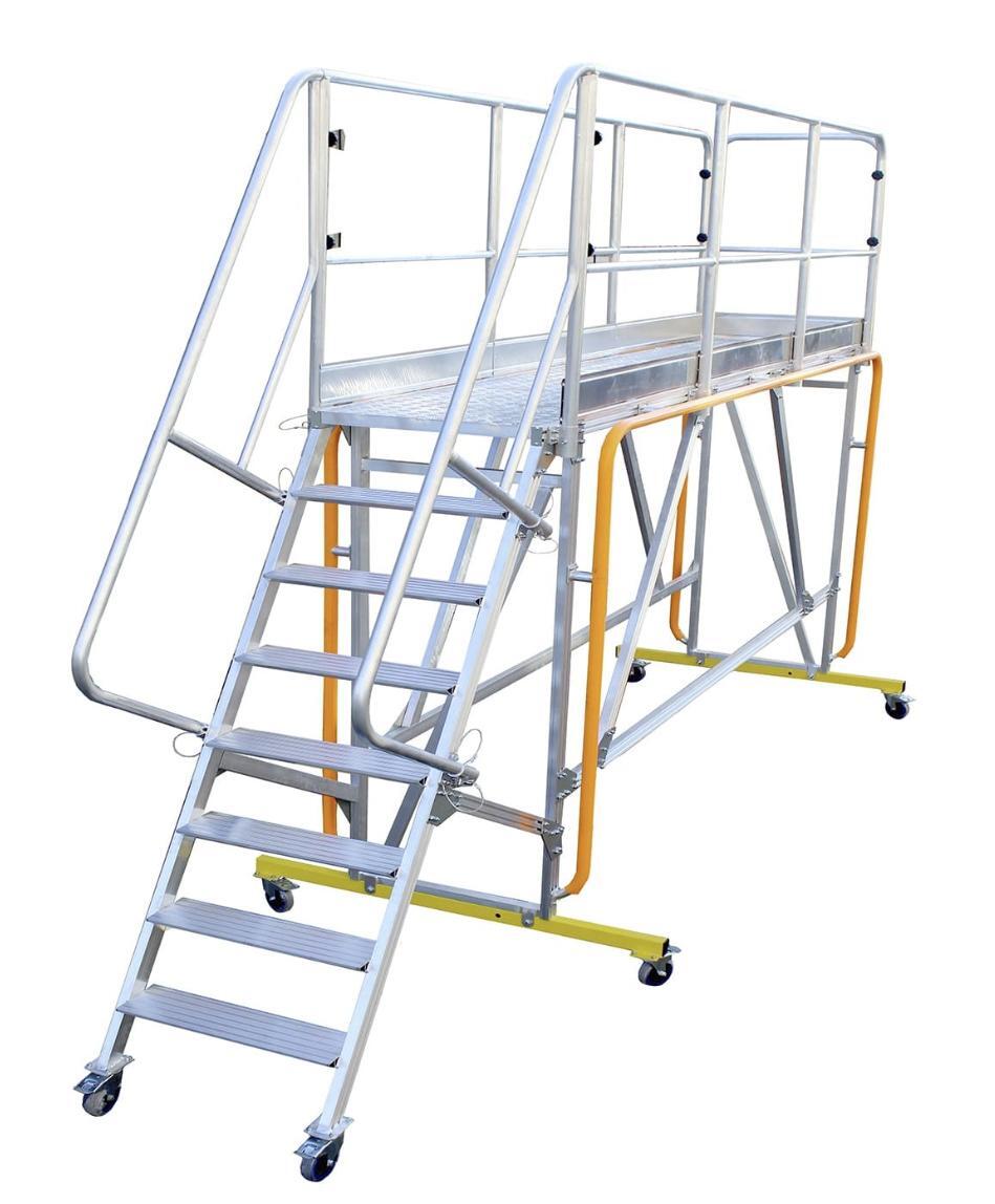 Площадка авиационная алюминиевая MEGAL ПАА - 2,1 х 3,5 с силиконовыми отбойниками предназначена для размещения рабочих и материалов в зоне проведения работ внутри или вне помещения. Рабочая площадка изготовлена из рифленого листового алюминия. Имеет трёхстороннее ограждение и оборудована калиткой, для обеспечения сквозного прохода. Рабочая площадка и лестница оборудованы быстросъемными, усиленными перилами-ограждениями площадки и лестничного марша. Подъем осуществляется по широким ступеням глубиной 160мм из специального рифленого профиля. Основание лестницы и траверса оборудованы колёсами Ø125 мм с фиксаторами. Силиконовые отбойники защищают обслуживаемую технику от повреждений. Максимальная грузоподъемность обеспечивается за счет использования труб и профилей со стенкой не менее 2,5мм. Площадка имеет легкий вес за счет использования алюминиевых сплавов.