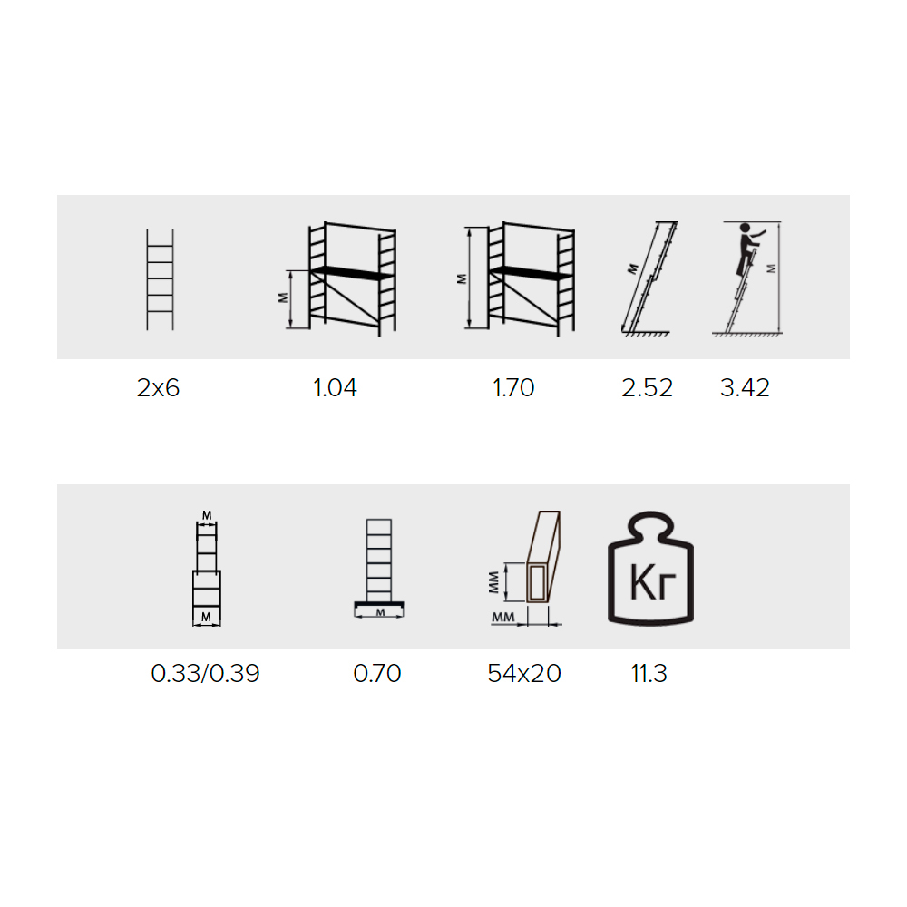 На каждой из секций лестницы есть 6 ступеней шириной 33 и 39 см. Ступеньки изготовлены из рельефного алюминиевого профиля, что предотвращает соскальзывание ног. Стабилизатор 70 м и комплект перекладин делают мостки устойчивыми. Общая высота помоста — 1,70 м. Настил из влагостойкой фанеры выдерживает вес до 150 кг.
