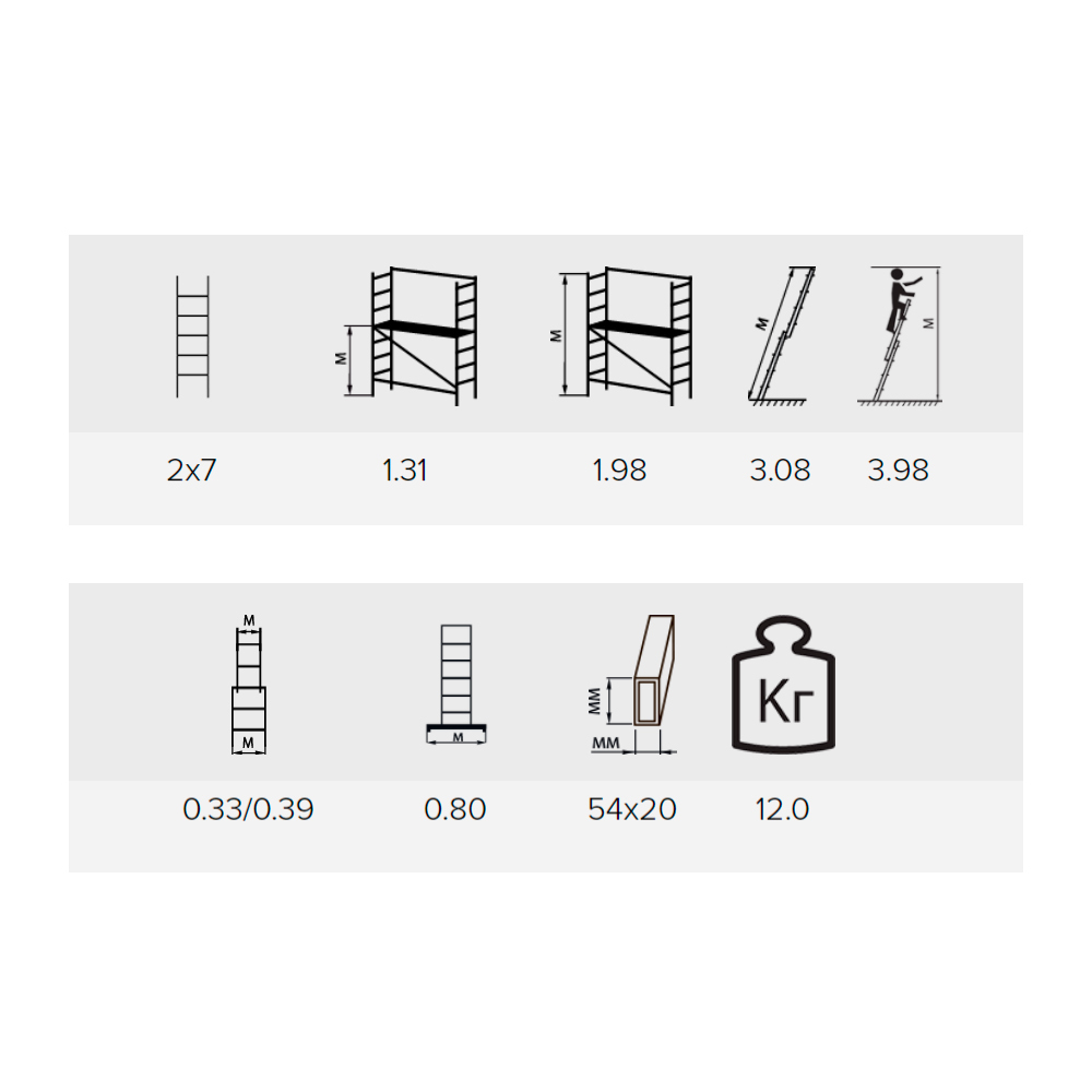 На каждой из 2 лестниц есть 7 ступеней. Ширина ступеней — 33 и 39 см. Стабилизатор 80 см и диагональная перекладина делают конструкцию устойчивой. Общая высота мостков — 1,96 м. Настил из фанеры выдерживает нагрузку до 150 кг.
