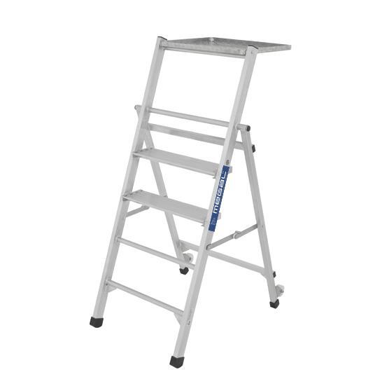 Подмости для штукатуров - отделочников MEGAL ПШО - 1,7 используются для внутренних отделочных работ. Широкая полочка помогает удобно расположить валики и другие инструменты. Широкие ступени глубиной 160 мм из специального рифленого профиля обеспечивают комфортное размещение рабочего.