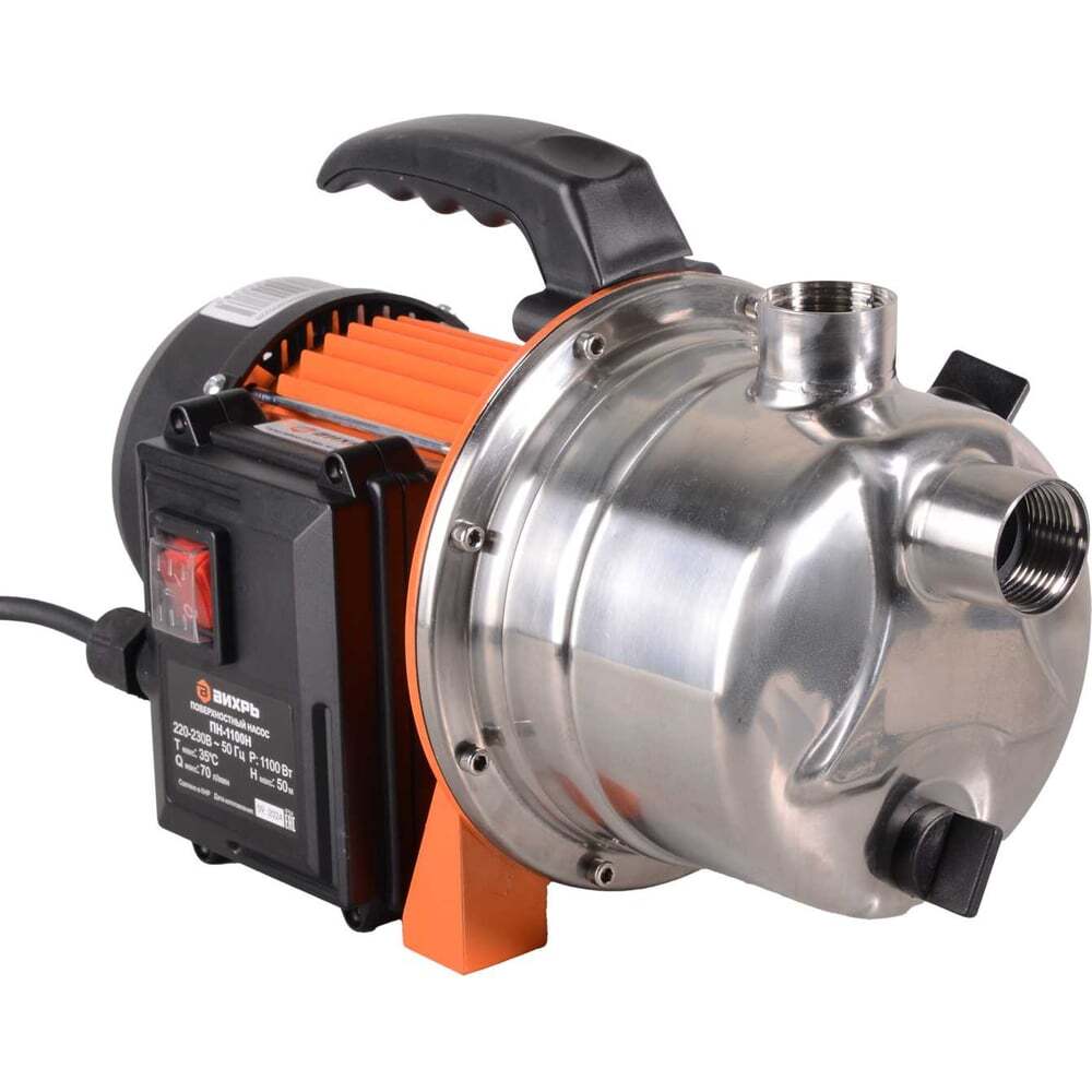 Поверхностный насос Вихрь ПН-1100Н центробежного типа подходит для перекачки чистой воды, в которой содержание механических частиц не превышает 150 г/м³. Электродвигатель мощностью 1100 Вт способен выкачивать воду с глубины до 9 метров и поднимать ее на высоту до 50 м. Его корпус выполнен из нержавеющей стали и устойчив к коррозии. Количество срабатываний двигателя в час ограничено 20 пусками. Это продлевает срок его службы. Насос оснащен эжектором. Производительность модели Вихрь ПН-1100Н составляет до 70 л/мин. График зависимости напора от высоты подачи воды указан в паспорте изделия.Поверхностный насос легко переносить за ручку, его вес 8 кг. Благодаря ножкам его можно установить на любой горизонтальной поверхности рядом с водоемом или колодцем. Входной и выходной патрубки имеют резьбу для штуцеров под шланги диаметром 1 дюйм. На корпусе расположены верхнее заливное и нижнее сливное отверстия. Перед включением в насосный отсек заливается вода. Не допускается работа всухую и попадание воздуха во всасывающее отверстие. При длительном простое воду необходимо слить, отсек промыть и просушить..Внимание! Внешний вид товара может отличаться от представленного на фото. Насос поставляется в двух вариантах: с металлической ручкой, с пластиковой ручкой.