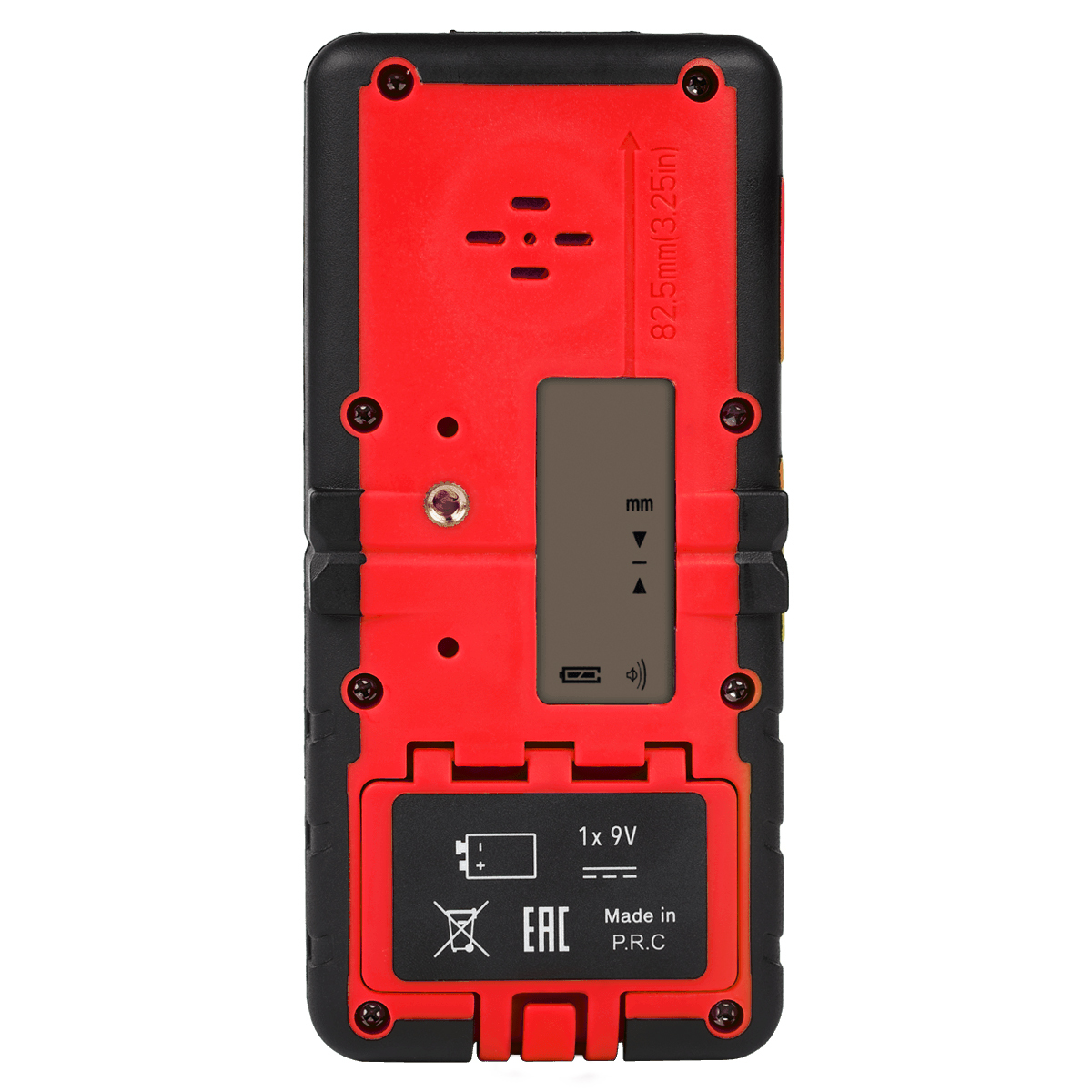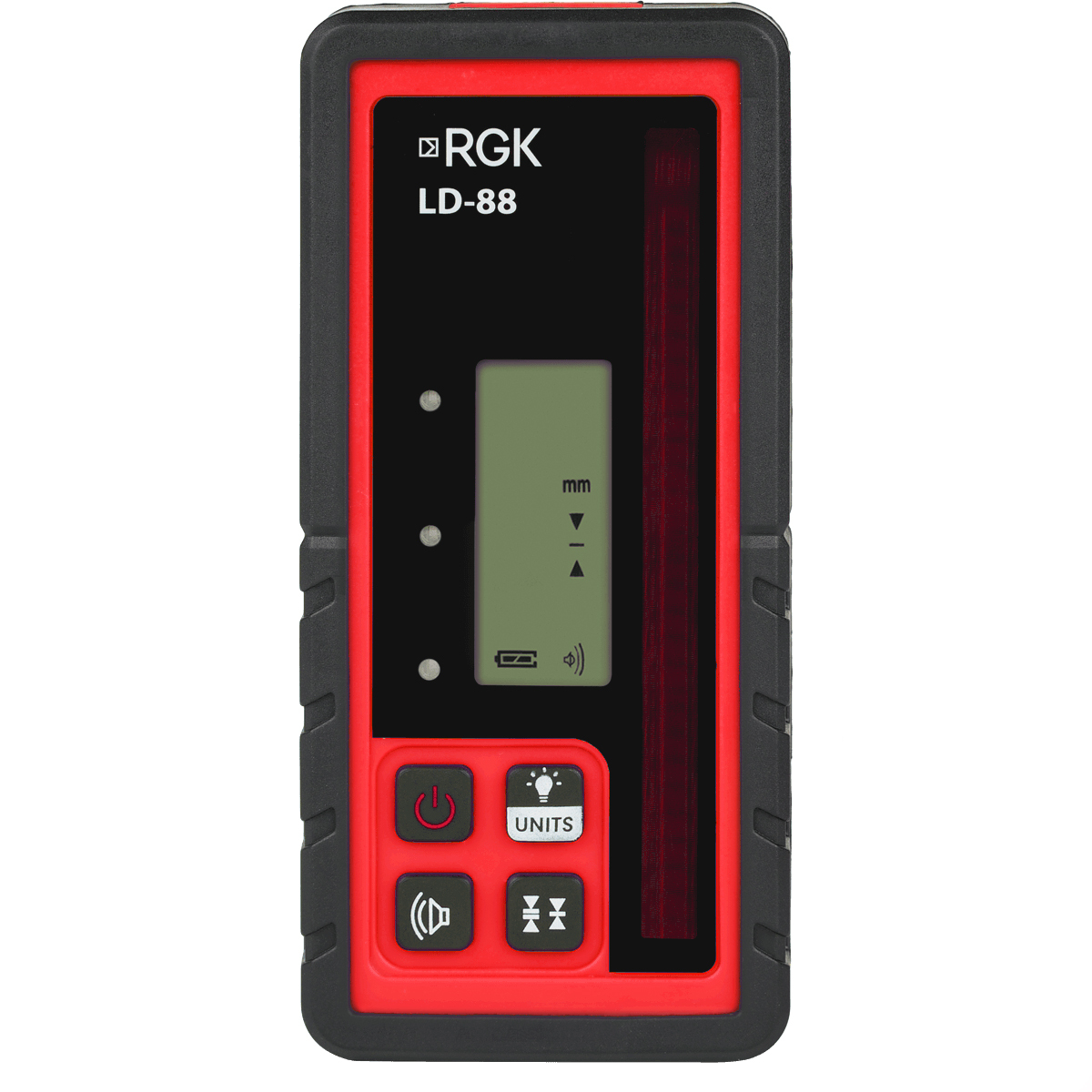 Лазерный приемник RGK LD-88 увеличивает рабочий диапазон ротационных лазерных нивелиров до 300 м. Также, прибор значительно облегчает работу при ярком солнечном освещении или на темных поверхностях, когда лазерный луч плохо заметен. Основные характеристики: Максимальное расстояние для работы – 300 м. Настраиваемые единицы измерения – мм или дюймы. Питание от батареи 9В типа "крона" - до 30 ч непрерывной работы. Основная особенность приемника заключается в наличии двух ЖК-индикаторов на корпусе. Это позволяет видеть отклонение от проецируемой плоскости с обеих сторон и не заслонять датчик, находясь перед прибором. Светодиоды в передней части приемника лазерного луча RGK LD-88 сигнализируют об отклонении приемника от нулевой отметки. В зависимости от положения луча – выше или ниже места нуля – индикаторы загораются различными цветами. Когда луч приведен в нулевую точку, загорается зеленый индикатор. Также, имеется звуковая индикация положения лазерного луча. Настраиваемые режимы точности позволяют откалибровать приемник в зависимости от точности и дальности установки лазерного нивелира. Так, вы можете настроить приемник на точность менее 1 мм, 2,5 мм и 5 мм.