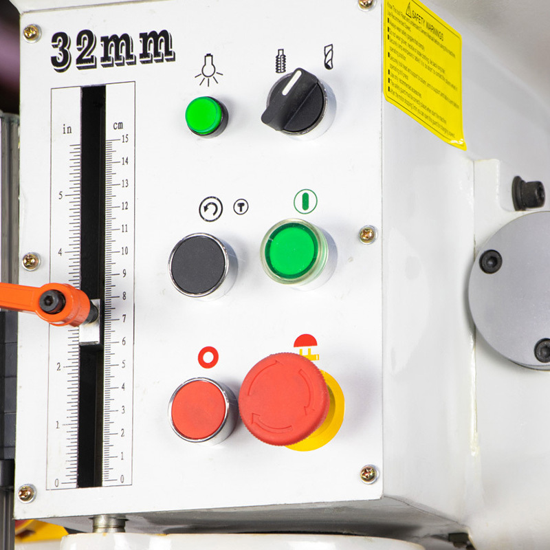 Станок обладает рядом особенностей. Данная модель произведена в напольном исполнении и требует надёжной установки на анкерные болты. Отдельно стоить отметить регулируемую автоматическую вертикальную подачу пиноли при сверлении с автоматическим отключением на заданную глубину. 8 скоростной ременный привод с промежуточным шкивом для снижения шума при работе и защитой от проскальзывания. Мощный асинхронный двигатель выдерживающий высокие нагрузки. Автореверс при нарезании резьбы, причём так же как автоподача – с настройкой заданной глубины.