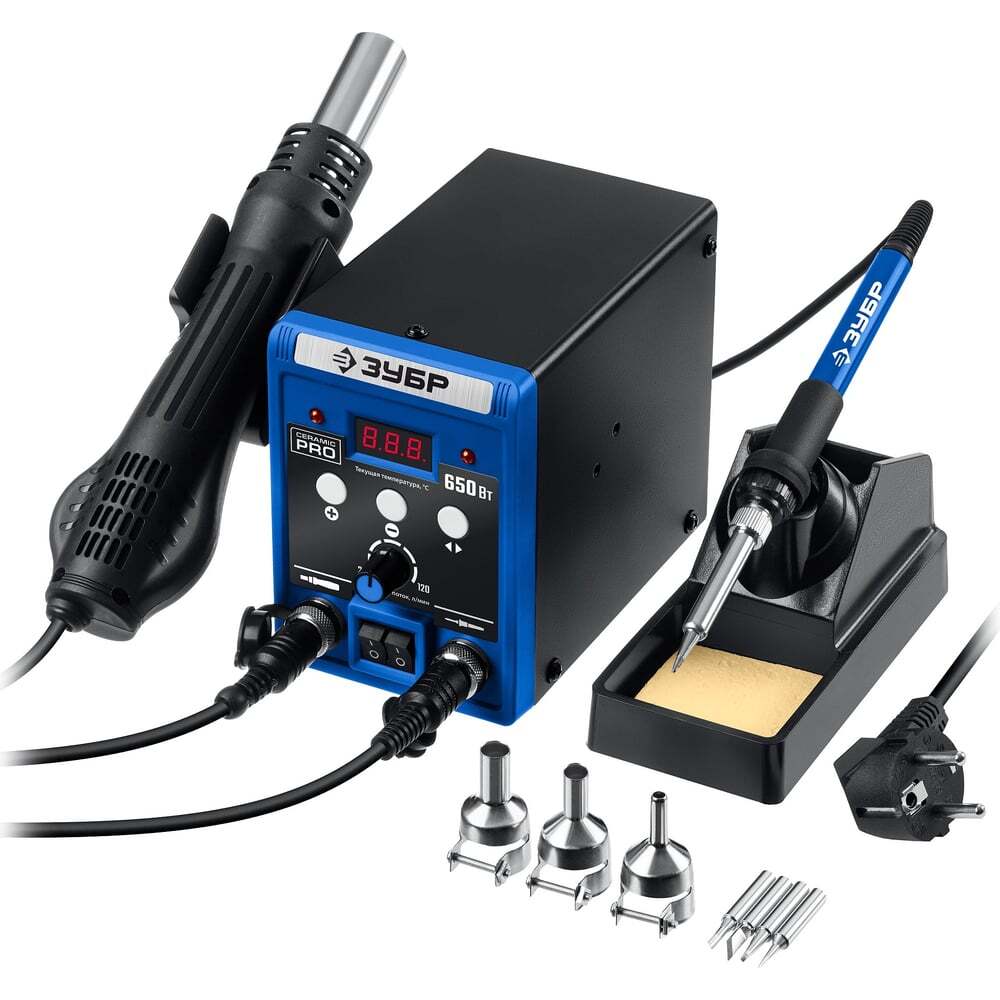 Ремонтная паяльная станция 2-в-1 100-480с, 650 вт, ЗУБР Пср-650 55427 применяется для демонтажа и пайки различных видов компонентов в корпусах, таких, как SOIC, PLCC, QFP, BGA используемых при технологии поверхностного монтажа. Технология поверхностного монтажа (или SMT технология) является наиболее распространенным на сегодняшний день методом сборки электронных узлов на печатных платах. Станция особенно удобна при пайке электронных плат и других мелких деталей, поскольку поддерживает заданную температуру и не нуждается в отключении от электросети во время работы. Замкнутая система датчиков, микроконтроллер для цифрового отображения данных и контроля температуры, большая стартовая мощность, быстрый разогрев и стабильность выбранной температуры, обеспечивают качество и удобство работы. Высококачественный керамический нагревательный элемент для быстрого достижения необходимой температуры. Уникальная функция неактивного состояния фена позволяет экономить энергию. Когда термофен кладется на держатель, система приводится в резервное состояние готовности. Как только фен снимается с держателя, система возвращается к установленным настройкам.