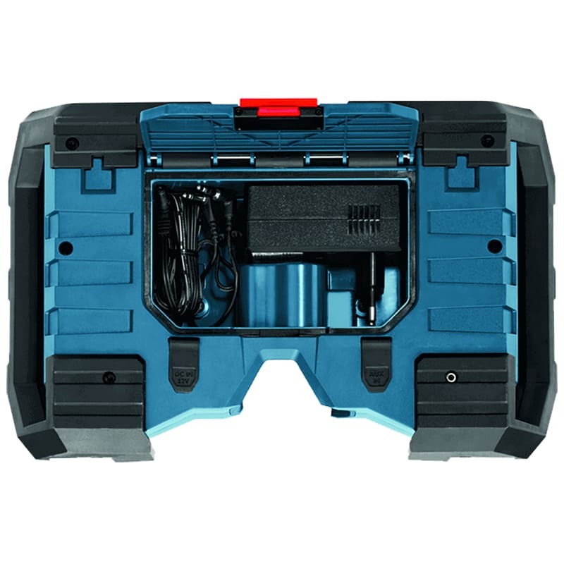 Аккумуляторный строительный радиоприёмник с возможность подключения к электросети, или к питанию от литиево-ионной аккумуляторной батареи. Динамики для воспроизведения музыки, транслируемой FM/AM-радиостанциями, и MP3-файлов. Подключение внешних носителей через Aux-In.