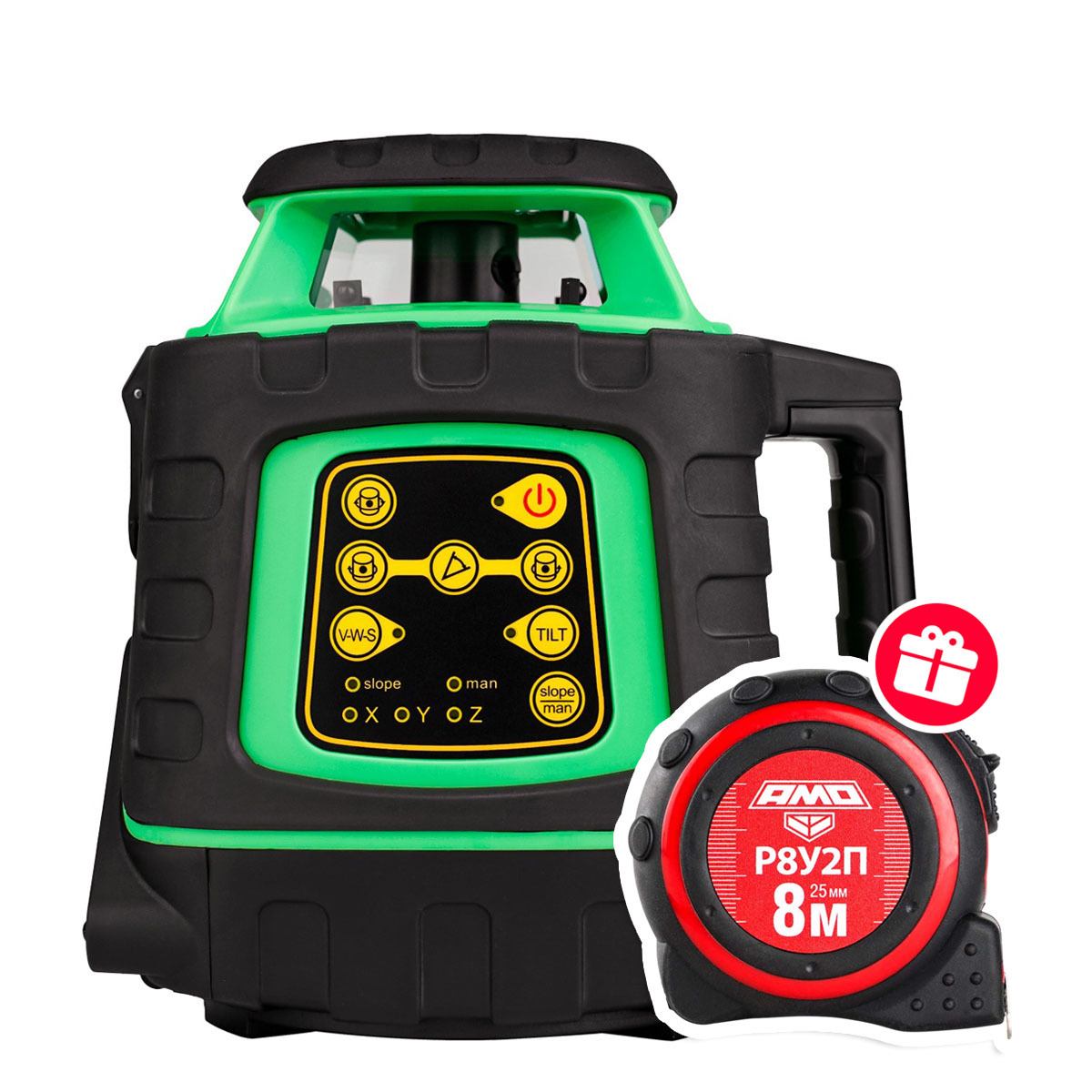 Лазерный уровень AMO ROTOR 300G - это надежный и практичный прибор, который в первую очередь ориентирован на домашних мастеров. Нивелир проецирует горизонталь и вертикаль, которые составляют крест. Лучи хорошо видно на дистанциях до 20 м, точность линий при этом достигает ±3 мм/10 м. Благодаря таким рабочим характеристикам модель отлично подходит для ремонта и отделки квартиры, частного дома или благоустройства дачного участка. Компенсация наклона При разблокированном маятнике функция автовыравнивания автоматически компенсирует погрешности установки до 4°. В случае разгоризонтовки, превышающей этот предел, лазерные лучи начнут мигать. Установка под углом При отключенном маятнике лазерный нивелир AMO ROTOR 300G может строить линии и плоскости с произвольным наклоном, что очень удобно для отделки и установки лестничных пролетов, укладки плитки и иных декоративных элементов интерьера. Для более точной и комфортной работы под наклоном прибор следует установить на подходящий штатив с резьбой 1/4". Надежность Устройство выполнено из прочного пластика, все углы и выступающие части прорезинены, а оптические элементы утоплены в корпус для защиты от падений. Категория пылевлагозащиты IP54 гарантирует устойчивость к проникновению пыли и воды. Энергоэффективность Нивелир питается от двух батарей типа “АА”, при этом одного комплекта элементов питания хватает на 22 часа непрерывной работы. Эргономика Лазерный уровень AMO ROTOR 300G удобно лежит в руке, крупными кнопками комфортно пользоваться в перчатках. Небольшой вес и размеры обеспечивают удобство пользования и транспортировки.