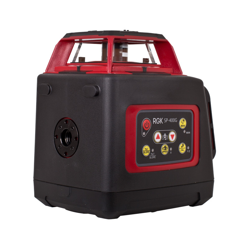 Ротационный нивелир RGK SP-400G предназначен для работы с приёмником на расстоянии до 200 метров. Точность горизонтальной плоскости ±1 мм на 10 м, а вертикальной — ±1,5 мм на 10 м. Выравнивание выполняется с помощью сервоприводов в диапазоне ±5°. При выходе за пределы автовыравнивания лазер остановит вращение и отключится. Лазерный отвес помогает точно установить уровень RGK SP-400G над определённой точкой, а также выполнять перенос точек по вертикали. Точность отвеса — ±0,15 мм/м для верхнего луча и ±0,3 мм/м для нижнего. Функция наклонного луча позволяет задать плоскости любой угол наклона при конструкции откосов, насыпке и выравнивании склонов и других работах на наклонной поверхности. Изменение скорости вращения лазера обеспечивает стабильную видимость линии на всём диапазоне работы и экономию заряда батареи. Ротационный уровень RGK SP-400G поддерживает скорости в 300 и 600 оборотов в минуту. Остановив вращение, можно проецировать статичную точку. Режим сканирования позволяет проецировать сектор с углом 10°, 30° или 60° с одной из двух скоростей, а при остановке фиксирует точку в центре сектора.