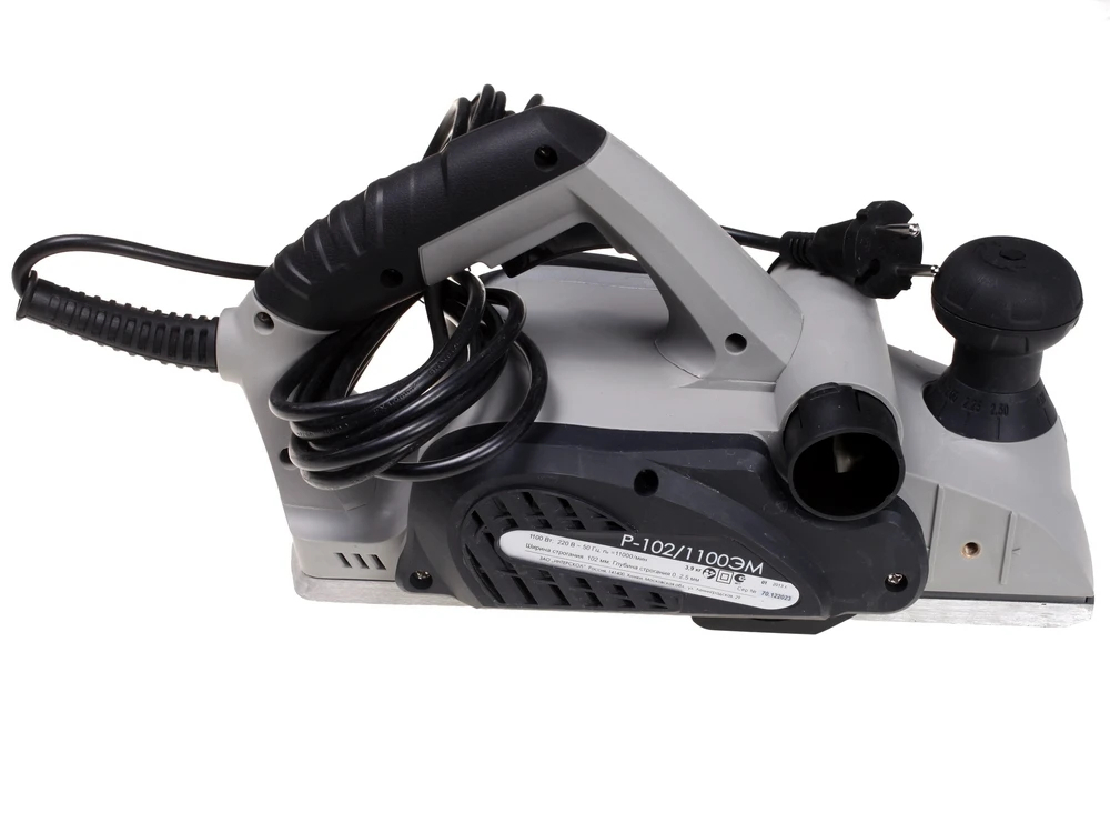 Наибольшая глубина строгания рубанка Интерскол составляет 2,5 мм. Регулировать глубину снятия стружки можно винтом на передней рукоятке. Ширина строгания 102 мм за один проход позволяет обрабатывать широкие детали за короткое время.