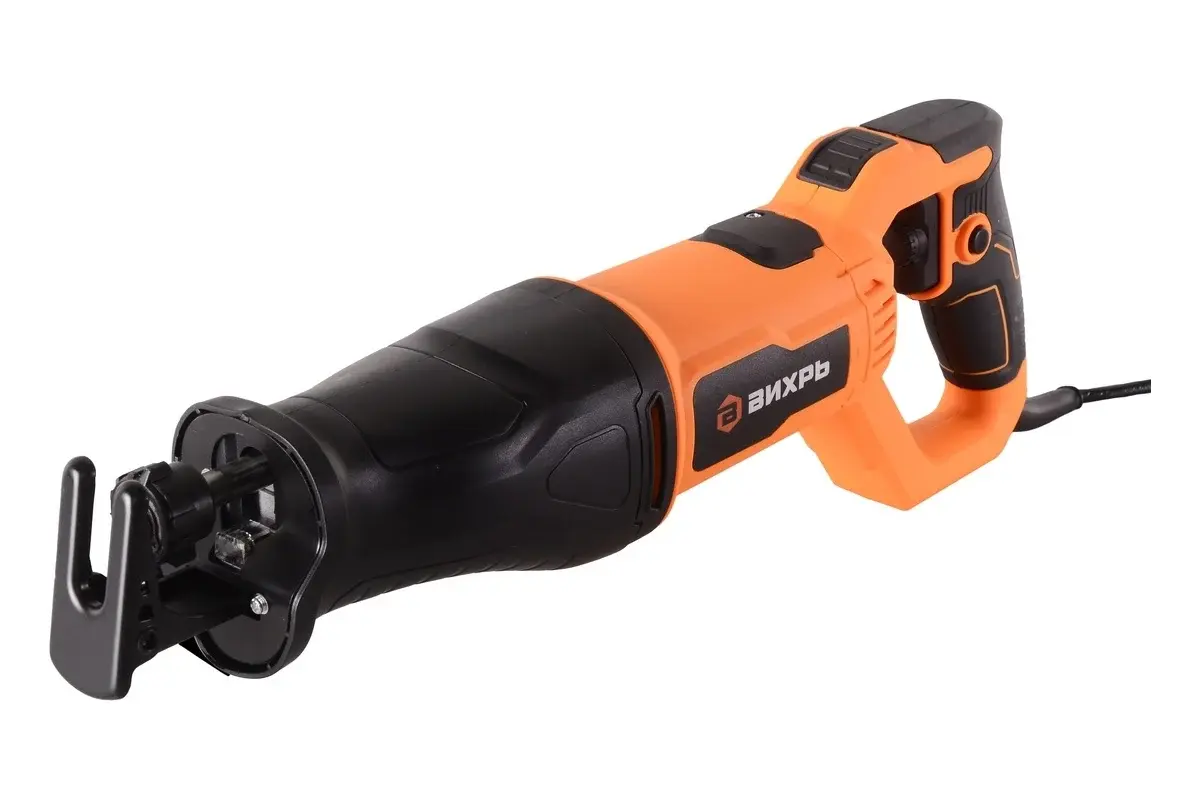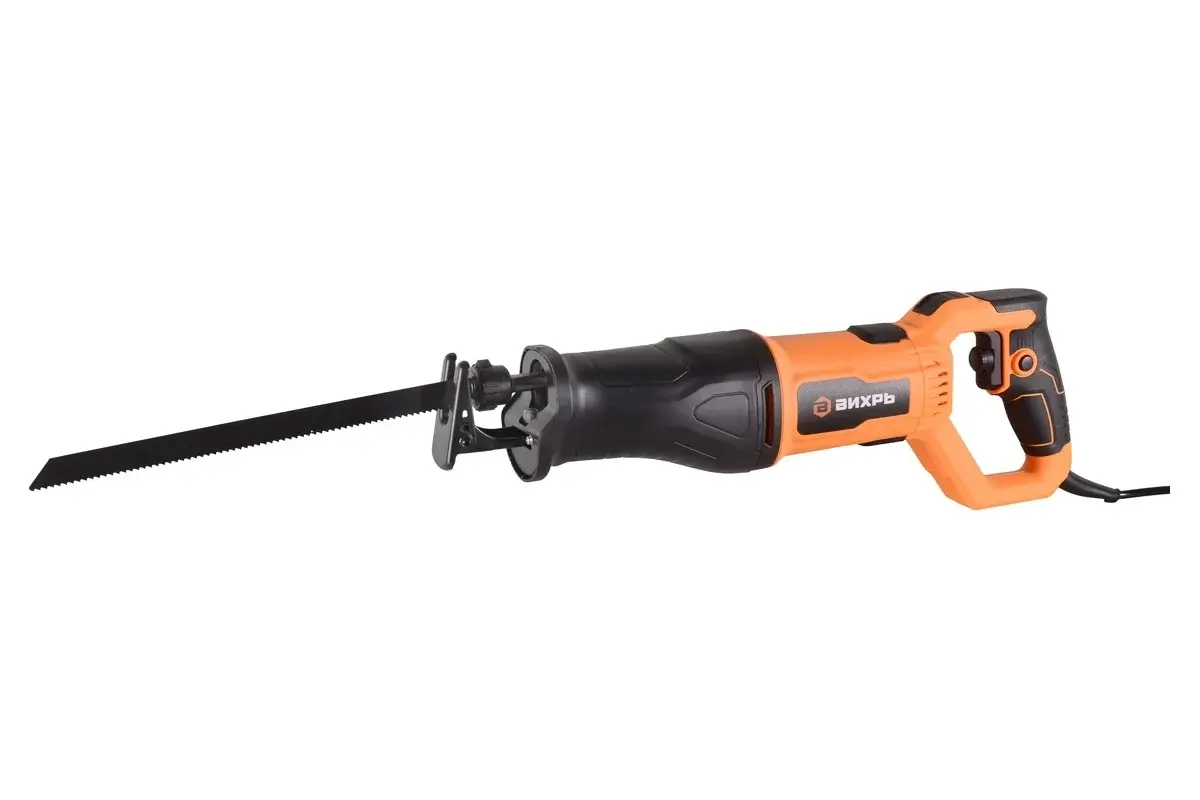 Сабельная пила Вихрь ПС-1300Э работает от однофазной электросети. Кабель длиной 2 м обеспечивает удобство подключения. Клавиша запуска расположена на рукоятке. Она фиксируется без необходимости постоянного удерживания. Дополнительная кнопка блокирует пусковой курок, препятствуя случайному включению. Нескользящее резиновое покрытие создает надежный хват. Светодиодная подсветка рабочей зоны позволяет выполнять работу высокой точности даже при слабом освещении. Вес модели 3,66 кг дает возможность оператору работать длительное время без перерывов. Пилка по дереву входит в комплектацию.