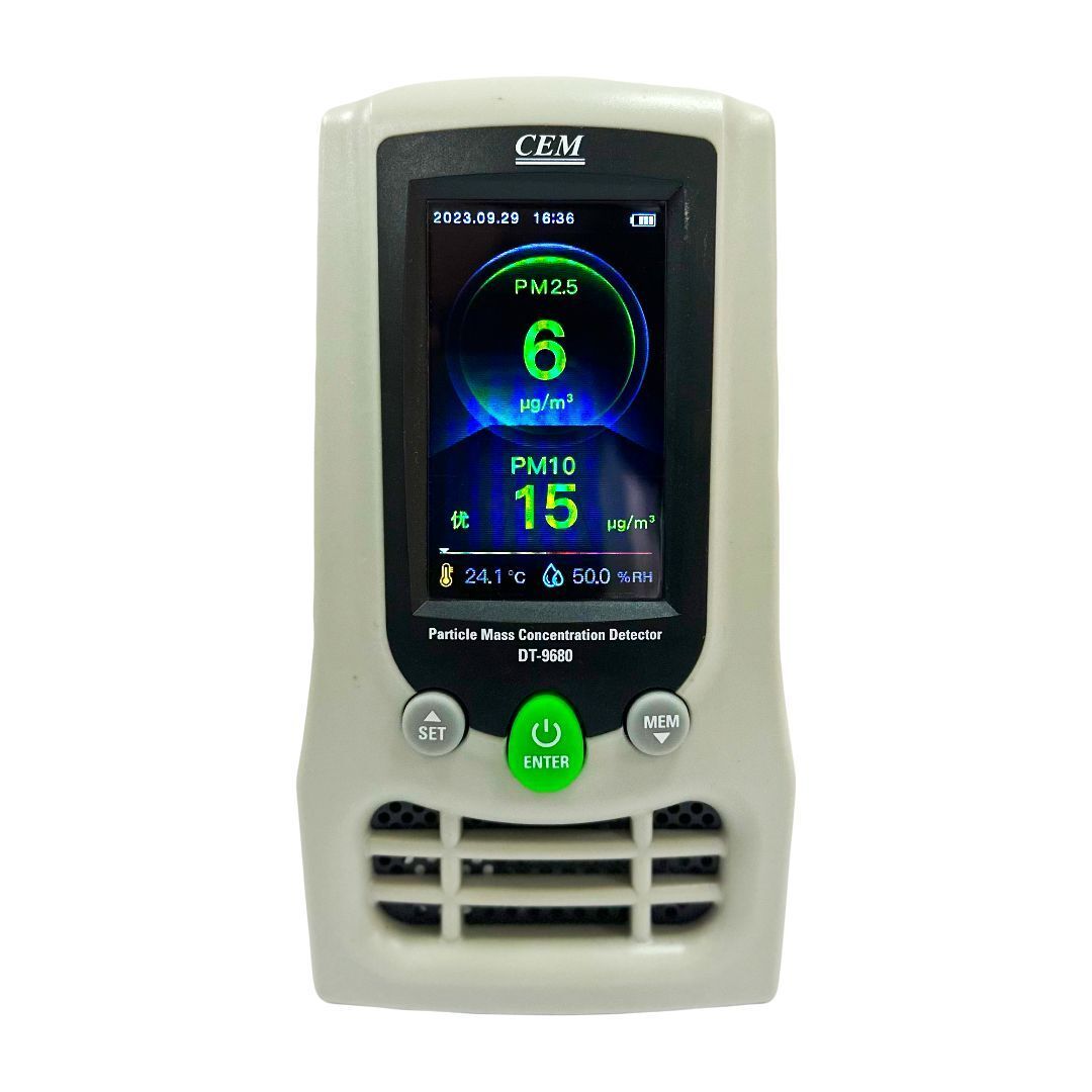 DT-9680 оснащен 3"-дюймовым, цветным TFT ЖК-экраном. Данное устройство представляет собой детектор качества воздуха, оснащен несколькими режимами измерений. Он позволяет определять содержание взвешенных твердых частиц РМ2.5, РМ10, формальдегида и летучих органических соединений. В нем применяется метод взвешенного испытания по рассеянию лазерного излучения. Детектор отличает профессиональный дизайн, он оснащается надежным вентилятором и самым современным алгоритмом определения количества взвешенных частиц, который позволяет точно и с высокой степенью чувствительности отображать на дисплее концентрацию частиц РМ2.5 и РМ10 в воздухе помещения и принять меры по очистке воздуха. В детекторе применяется профессиональный датчик определения содержания формальдегида НСНО и датчик суммарного содержания летучих органических соединений TVOC, включая токсичные бензол и стирол. Летучими называют вещества, которые испаряются при низких температурах.