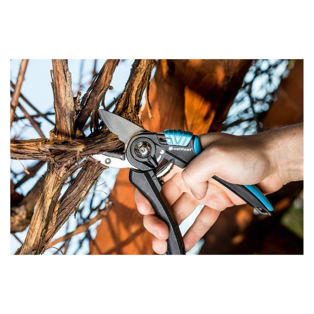 Секатор Cellfast ERGO (41-021) - эргономичный контактный секатор для сухих веток 10-18 мм, оснащен регулировкой рукояток для удобства работы пользователя с крупной и маленькой ладонью. Имеется блокировка открытия. Надежность изделия и удобство в работе обеспечиваются за счёт лезвий с антиналипающим тефлоновым покрытием, а так же верхней ручки, покрытой мягким противоскользящим материалом SAFETOUCH и пружины из нержавеющей стали.