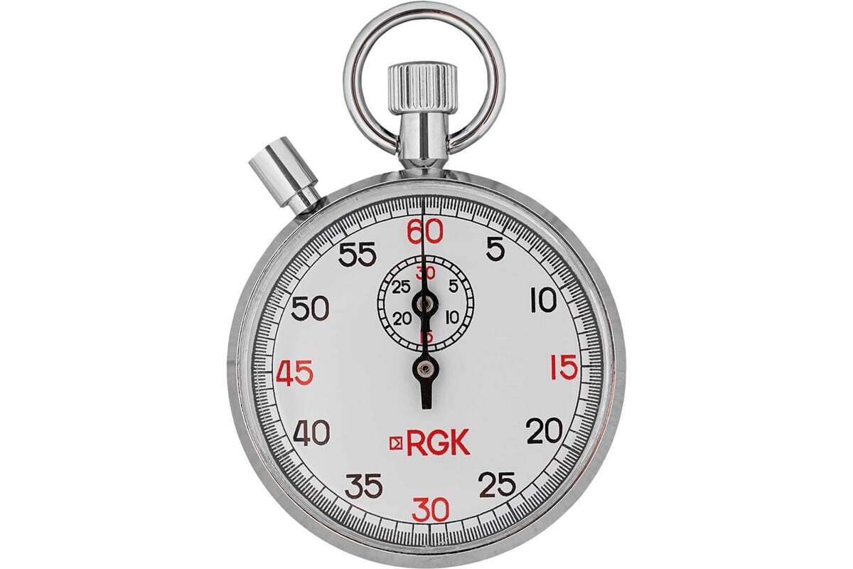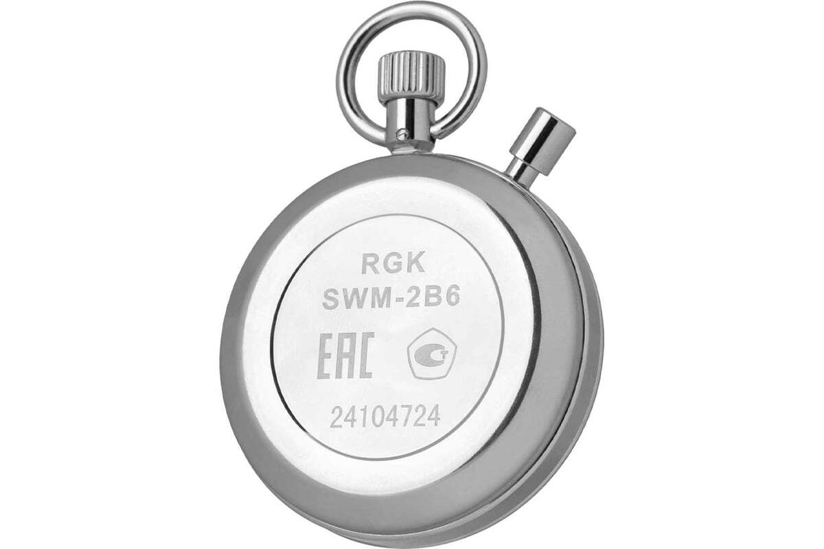 Прибор выполнен в корпусе диаметром 50 мм скругленной формы. Устройство удобно помещается в руку, позволяя выполнять все необходимые манипуляции в процессе измерений одной рукой. Считывание показаний в секундах производится с основного циферблата, а в минутах – с дополнительной круговой шкалы с отдельной стрелкой меньшего размера. Запуск и останов часового механизма производится с помощью анкерной системы, которая приводится в действие при нажатии на заводную головку, размещенную в верхней части механического секундомера RGK SWM-2B6. Для сброса измерителя, с автоматической установкой стрелок в нулевое положение, служит отдельная кнопка. Элементы механизма изготовлены из нержавеющей стали, а приводная пружина – из никелевого сплава. Для минимизации износа вследствие истирания изделие снабжено 13 камнями из синтетического рубина.