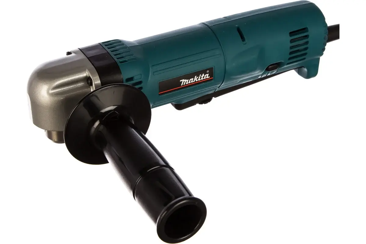 дрель Makita DA3010F оптимальна для работы в стесненных условиях, там, где с прямой дрелью просто-напросто не развернуться. Как и все угловые дрели, она оснащена Г-образным редуктором. Таким образом, рабочие насадки устанавливаются под углом 90 C к корпусу. Высота рабочей головки составляет всего 66 мм. Прочный ключевой патрон надежно фиксирует рабочий инструмент с хвостовиком 1-10 мм. Для того чтобы ключ ненароком не затерялся, на усиленной части сетевого шнура предусмотрена практичная «петля» для его хранения. Несмотря на внешнюю «непоказательность», дрель чрезвычайно производительна, вынослива и комфортна в эксплуатации. Использование шарикоподшипников в конструкции обеспечивает ее особую надежность и долговечность. Посредством инструмента можно сверлить в древесине отверстия диаметром до 25 мм, в стали – до10 мм и работать с крепежом. Скорость в процессе работы с дрелью Макита DA3010F регулируется электроникой. Для более точного ведения работ предусмотрен ограничитель максимального числа оборотов. Застрявшее сверло поможет извлечь эффективный реверс, эта же функция будет полезна при работе с крепежом. Управление осуществляется посредством простых и понятных кнопок и рычагов, с удобным расположением. Эргономичный корпус комфортно ложится в ладонь. Дрель Makita DA 3010 F оптимальна для работы одной рукой, но для сложных случаев предусмотрена возможность установки боковой дополнительной рукоятки. Для этого в металлическом корпусе редуктора по обе стороны имеются гнезда с резьбой. Для работы в условиях недостаточного освещения дрель оснащена встроенной надежной лампой локальной подсветки, которая не нуждается в замене на протяжении всего срока службы инструмента. Благодаря двойной электроизоляции дрель может подключаться к незаземленным розеткам.