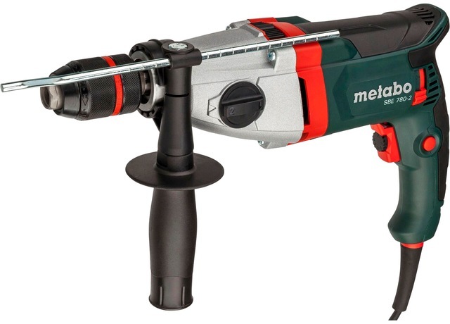 Ударная дрель Metabo SBE 780-2 600781000 предназначена для сверления в древесине, металле и кирпиче. Наличие быстрозажимного патрона способствует быстрой замене оснастки. Кнопка фиксации включенного состояния обеспечивает более продолжительную и удобную работу. Дополнительная рукоять дает возможность крепко держать инструмент в ходе эксплуатации. Функция реверса представлена поворотом щеток, что обеспечивает равную мощность при разностороннем вращении, а также увеличивает рабочий ресурс угольных щеток.