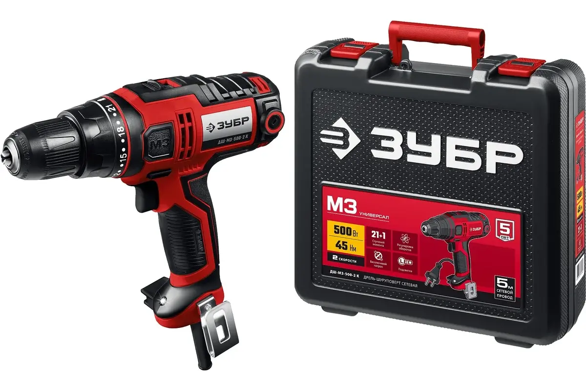 Сетевая дрель-шуруповерт ЗУБР ДШ-М3-500-2 К — мощный универсал на 500 Вт для завинчивания крепежа и сверления в любых условиях. Яркая подсветка четко освещает зону работ даже в темноте, а 5-метровый кабель дает свободу перемещения без удлинителей. Широкая функциональность, простота управления и надежность.