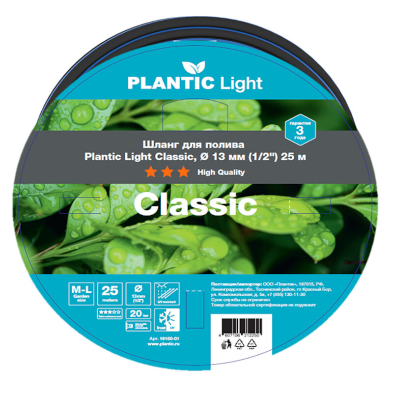 Шланг Plantic Light Classic 1/2" 25м состоит из трех слоев с перекрестным армированием. Изготовлен из качественных материалов. Не содержит фталатов, кадмия, бария и свинца. Армирование с обновленной технологией̆ препятствует вращению шланга под давлением, сохраняет устойчивость формы, обеспечивает постоянный̆ поток и исключает перегибы. Имеет защиту от ультрафиолетовых лучей. Соответствует требованиям Европейского стандарта качества RoHS. Максимальная/минимальная температура хранения: +60С -10 C. Рекомендуемое давление 20 бар. Внутренний диаметр 12,5мм, толщина стенки 2мм, наружный диаметр 16,5мм. Совместим с продукцией других производителей.