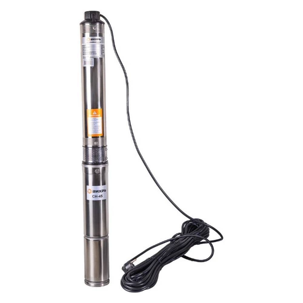 Скважинный насос Вихрь СН-45 может погружаться на глубину до 35 м. Внутри корпуса установлен набор из плавающих импеллеров высокой прочности. В процессе работы они не соприкасаются друг с другом, что повышает эксплуатационные характеристики. Насосная часть изготовлена из пластика, что позволило снизить вес устройства до 8,52 кг. Температура перекачиваемой воды составляет от +1°до +35° С.