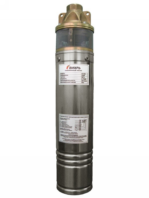 Скважинный насос модели Вихрь СН-50 предназначен для подачи воды в автономные системы водоснабжения из средне- и малодебетовых скважин. Насос мощностью 0.75 кВт рассчитан на глубину погружения до 40м, обеспечивает подъём воды на высоту до 50м с производительностью до 40л/мин. Он может использоваться также в шахтных колодцах, ёмкостях, а также для забора воды из открытых водоёмов с содержанием в ней песка не более 40г/м³. Диаметр агрегата – 102мм. Внутренний диаметр выходного отверстия – 1".