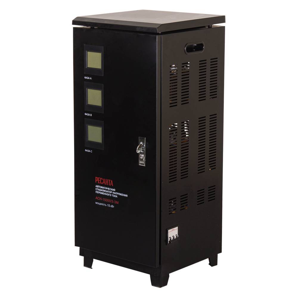 Стабилизатор напряжения Ресанта АСН-15000/3 - трехфазный, электромеханического типа, применяется для выравнивания входного напряжения и защиты приборов от перепадов напряжения с суммарной мощностью до 15кВт. Подходит для производственных и офисных зданий. Работает с выходным напряжением 380В с точностью до +/-2%. Устройство оснащено фильтрами сетевых помех, предотвращающими искажение частотной синусоиды, микропроцессорным управлением и цифровым индикатором напряжения. Превышение пределов поддерживаемого входного напряжения автоматически отключает подачу питания. Прочный корпус защищает внутренние узлы аппарата от повреждений. Благодаря транспортировочным колесам стабилизатор можно с легкостью перемещать. Защита от выхода напряжения за пределы рабочего диапазона стабилизатора (рабочий диапазон стабилизатора от 240В до 430В). Термозащита (тепловая защита) позволяет выключиться стабилизатору при превышении его мощности нагрузки над мощностью самого устройства.