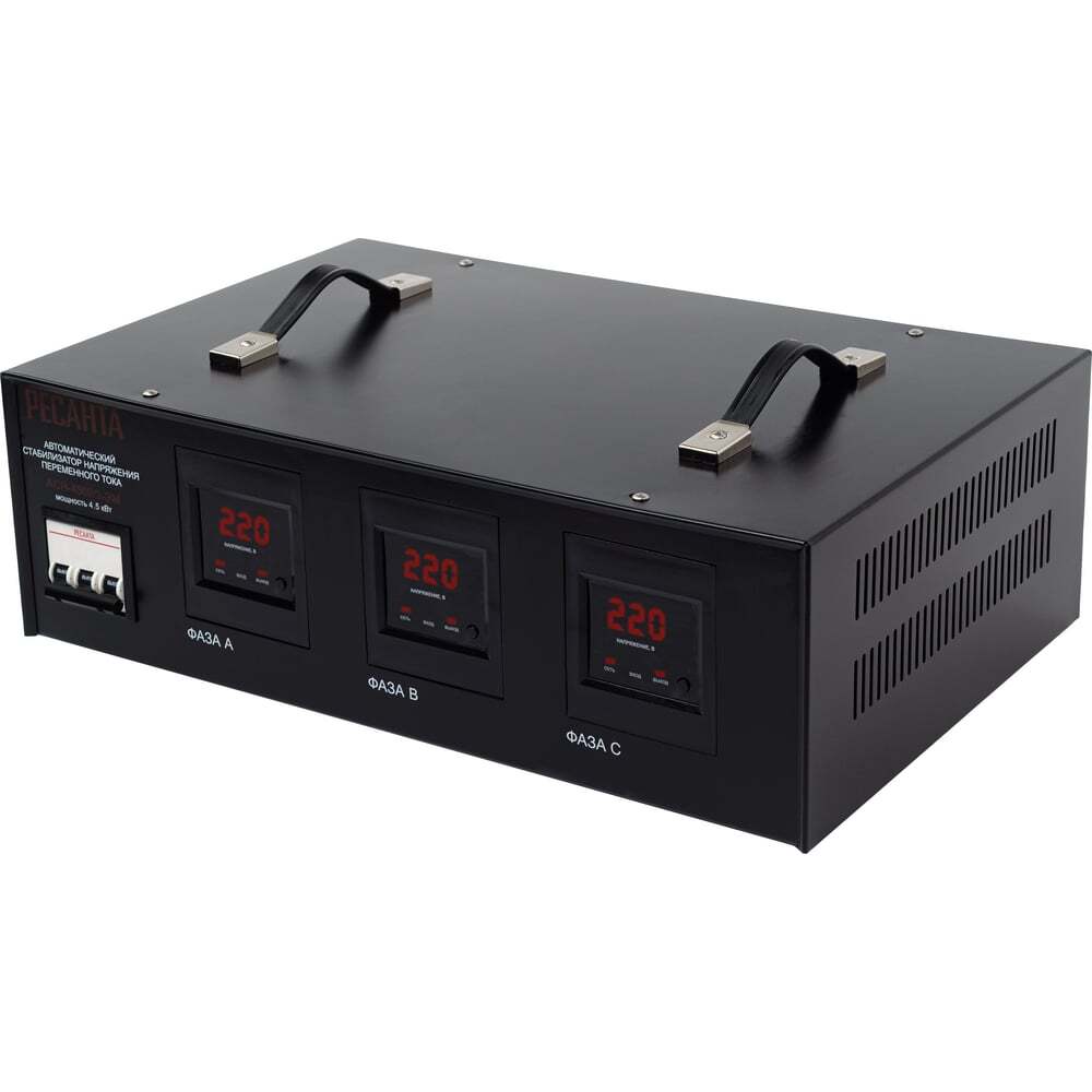 Модель трёхфазного стабилизатора напряжения Ресанта АСН-4500/3-ЭМ относится к приборам электромеханического типа и служит для защиты электрооборудования от перепадов напряжения питающей сети. Преимуществом этой модели является высокая точность, которая составляет +/-2%. Выходное напряжение – 380В. Суммарная расчётная мощность составляет 4.5 кВт. Прибор получил высокочувствительный фильтр сетевых помех и системы защиты, отключающие его в случаях выхода значения входного напряжения за пределы расчётного диапазона и при увеличении общей мощности подключённого электрооборудования. Рабочий температурный диапазон прибора от -5°С до +40°С.Управление стабилизатором напряжения микропроцессорное. На лицевой панели и находятся органы управления и три LED-дисплея. Модель АСН-4500/3-ЭМ выполнен в прочном металлическом корпусе, обеспечивающим защиту узлов от механических повреждений, и имеет удобные ручки для транспортировки. Ресанта АСН-4500/3-ЭМ относится к категории малогабаритных приборов. Вес прибора – 22 кг. Тип установки – напольный.