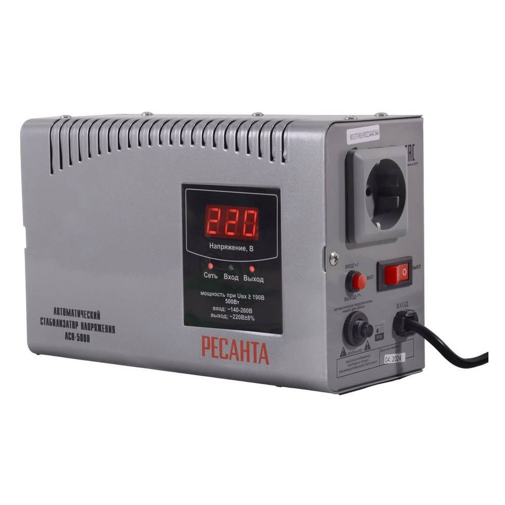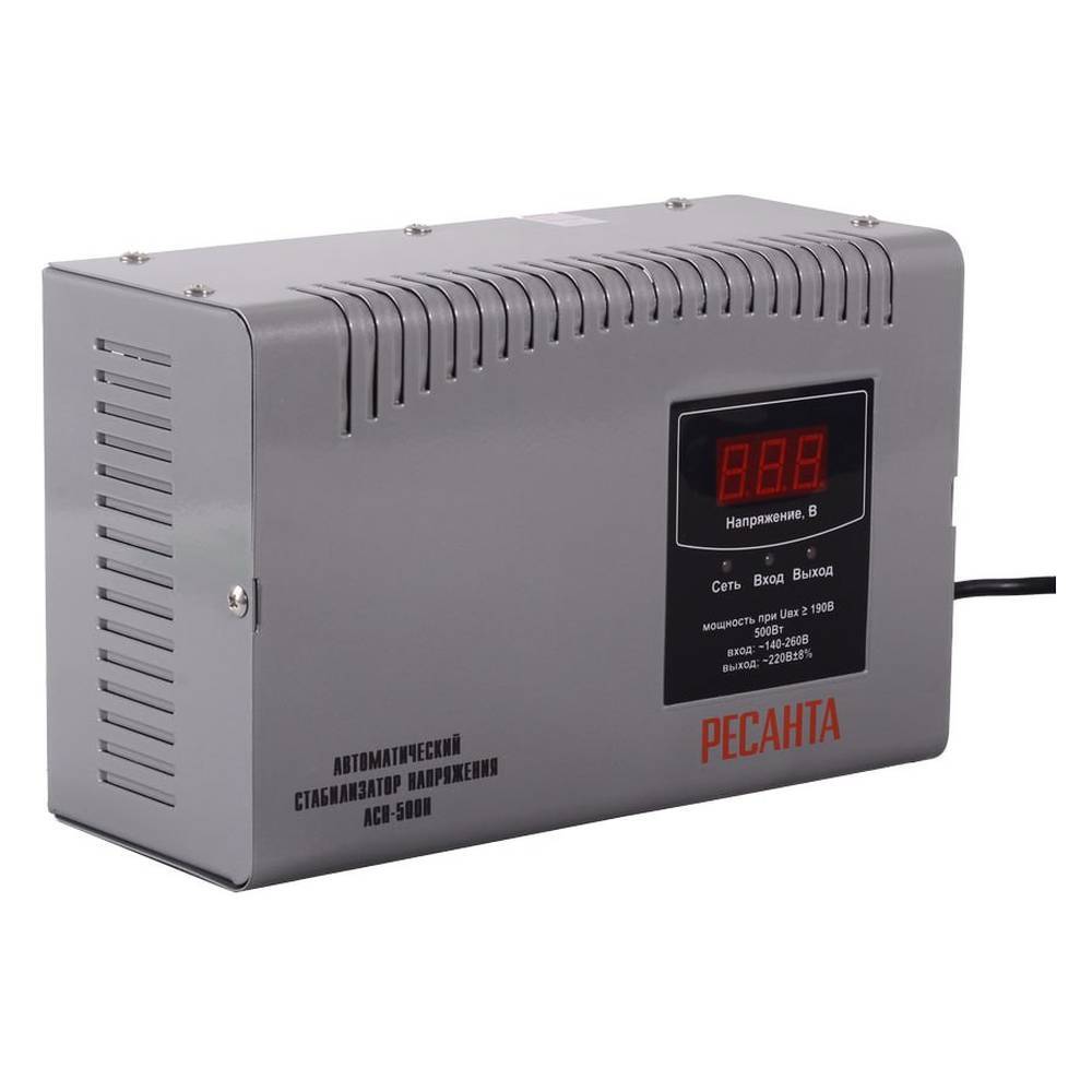 Стабилизатор напряжения Ресанта АСН-500 Н релейного типа предназначен для выравнивания входного напряжения и защиты приборов от перепадов напряжения с суммарной мощностью до 500Вт. Работает с напряжением 220В с точностью до +/-8%. Устройство оснащено фильтрами сетевых помех, предотвращающими искажение частотной синусоиды, микропроцессорным управлением и цифровым индикатором напряжения, на котором отображаются параметры напряжения. Превышение пределов поддерживаемого входного напряжения автоматически отключает подачу питания. Прочный корпус защищает внутренние узлы аппарата от повреждений. Данный стабилизатор может обеспечивать стабильным питанием - телевизор, ресивер, DVD проигрыватель, кассовый аппарат, газовый котел.