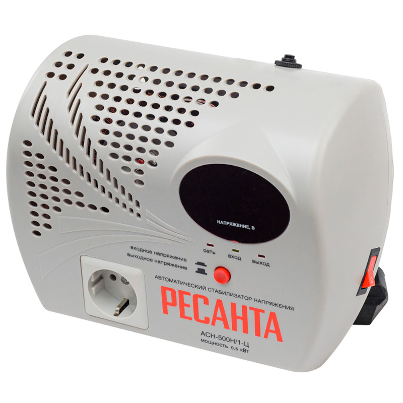 Стабилизатор напряжения серии LUX РЕСАНТА АСН-500Н/1-Ц релейного типа предназначен для выравнивания входного напряжения и защиты приборов от перепадов напряжения с суммарной мощностью до 0,5 кВт. Время регулирования - 5 мс. Работает с напряжением 220В с точностью до +/-8%. Устройство оснащено фильтрами сетевых помех, предотвращающими искажение частотной синусоиды, микропроцессорным управлением и цифровым индикатором напряжения, на котором отображаются параметры напряжения. Превышение пределов поддерживаемого входного напряжения автоматически отключает подачу питания. Прочный корпус защищает внутренние узлы аппарата от повреждений. Данный стабилизатор может обеспечивать стабильным питанием - телевизор, ресивер, DVD проигрыватель, кассовый аппарат, газовый котел.