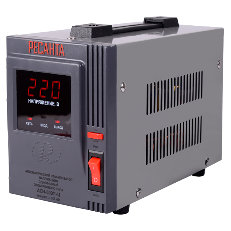 Стабилизатор напряжения Ресанта АСН 500/1-Ц релейного типа предназначен для выравнивания входного напряжения и защиты приборов от перепадов напряжения с суммарной мощностью до 0,5 кВт. Работает с напряжением 220В с точностью до +/-8%. Устройство оснащено фильтрами сетевых помех, предотвращающими искажение частотной синусоиды, микропроцессорным управлением и цифровым индикатором напряжения, на котором отображаются параметры напряжения. Превышение пределов поддерживаемого входного напряжения автоматически отключает подачу питания. Прочный корпус защищает внутренние узлы аппарата от повреждений. Данный стабилизатор может обеспечивать стабильным питанием - телевизор, ресивер, DVD проигрыватель, кассовый аппарат, газовый котел.