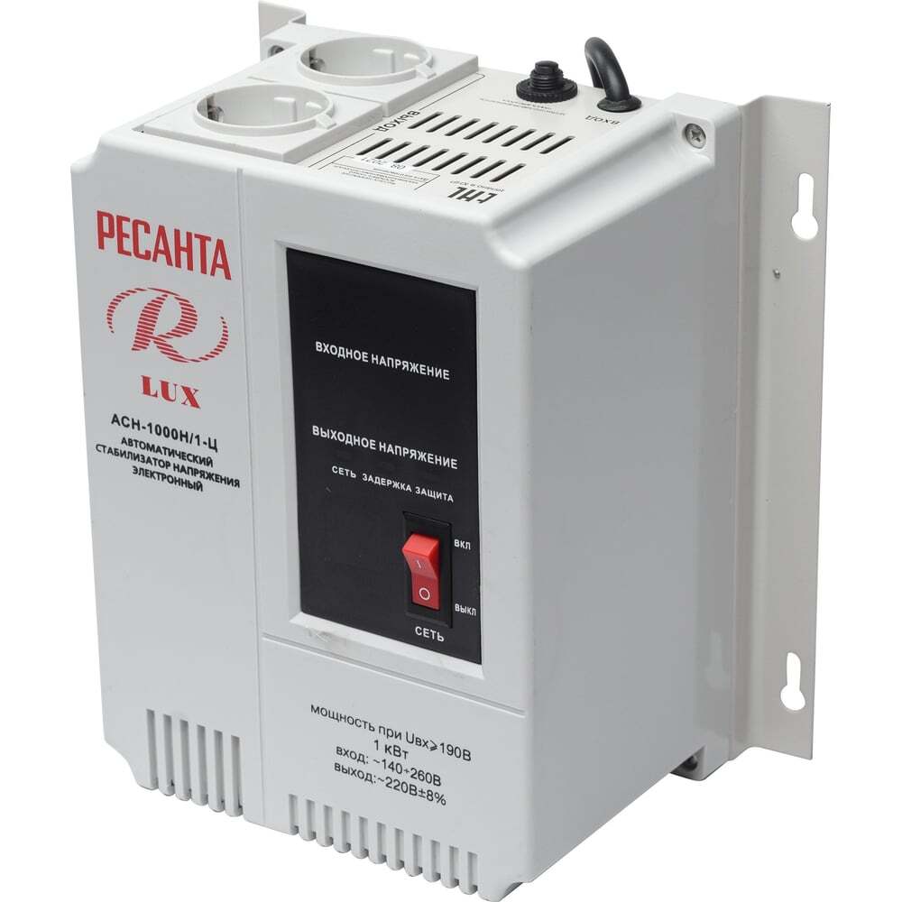 Однофазный стабилизатор напряжения Ресанта LUX АСН-1000Н/1Ц мощностью 1000 Вт с 2 розетками и led-дисплеем необходим для выравнивания параметров электросети и обеспечения защиты дорогостоящего оборудования, бытовой техники от поломки в результате скачков напряжения.Конструкция модели предполагает наличие реле, которое позволяет устройству быстро реагировать на изменение напряжения. Регулировка осуществляется в течение 15 мс, что минимизирует риск выхода из строя подключенных электроприборов. При выходе показаний напряжения за рамки допустимого диапазона (140-260 В) происходит автоматическое отключение питания, которое самостоятельно возобновляется после выравнивания напряжения. Кратковременные перегрузки никак не влияют на работу устройства, электроснабжение оборудования в таких случаях не прекращается.Стабилизатор напряжения оснащен встроенным фильтром входных и выходных частотных помех, микропроцессорной системой управления, led-экраном для выведения основных параметров. Вес установки составляет 3,7 кг, корпус адаптирован под размещение на стене.Компактная, простая и удобная в использовании модель Ресанта LUX АСН-1000Н/1Ц будет полезна в быту, на производстве и других объектах, где есть необходимость в защите электрооборудования и приборов от скачков напряжения.