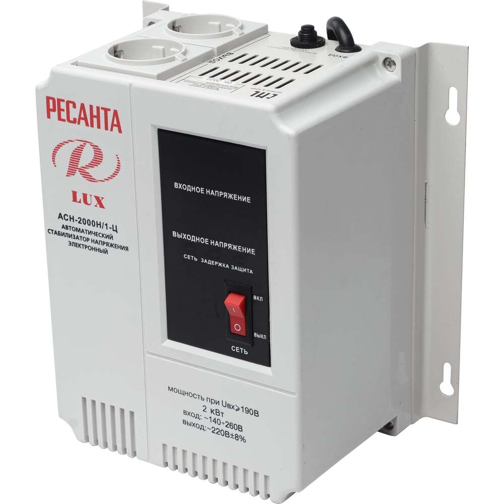 Стабилизатор напряжения Ресанта LUX АСН-2000Н/1Ц однофазный с входным напряжением 140-260 В и мощностью 2000 Вт защитит чувствительную к скачкам напряжения бытовую технику и другие электроприборы в случае изменения параметров сети. Преимуществом модели является наличие реле, которое отключает электропитание оборудования менее чем за 1 сек при повышении напряжения выше допустимой нормы. Моментальное реагирование на изменение параметров электросети обеспечивает защиту дорогостоящего оборудования от преждевременной поломки. В конструкции устройства предусмотрено наличие специальных фильтров, которые обеспечивают стабильность частотной синусоиды. Стабилизатор напряжения оснащен прочным корпусом с led-экраном для отображения показателей напряжения. Компактные габариты, небольшой вес (5 кг) и специальные планки с отверстиями для шурупов позволяют легко разместить стабилизатор на стене. Устройство охлаждается естественным воздушным путем, имеет систему защиты от перегрева и перегрузки. Рекомендуемый температурный режим для эксплуатации – от 0 до +40 градусов. Надежная, компактная, удобная в использовании модель с двумя розетками Ресанта LUX АСН-2000Н/1Ц пригодится на даче, в загородном доме, офисном или служебном помещении для стабилизации параметров электросети и защиты оборудования от поломки.