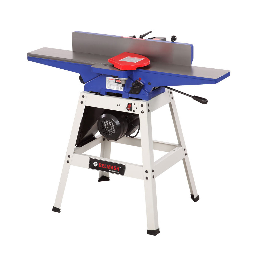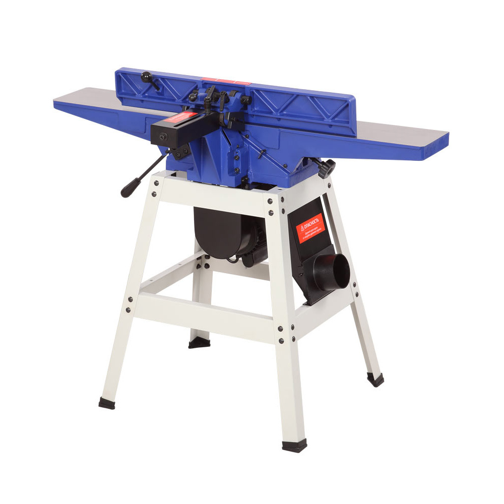 Станок предназначен для обработки древесины с целью придания ей необходимых размеров и форм. На станке можно выполнять фугование поверхностей. Параллельный упор позволяет осуществлять строгание под углом 90 и 45 градусов во внешнюю и внутреннюю стороны. Для отвода отходов обработки установлен аспирационный патрубок диаметром 100 мм, к которому можно подключить вытяжную установку. Рабочий стол и параллельный упор выполнены из чугуна. Для безопасной работы станок оборудован литым защитным кожухом ножевого вала. Также в комплекте есть специальные упоры для подачи заготовки. Устройство выполнено на сборной станине.