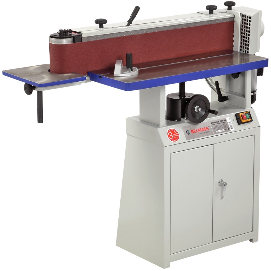 Станок BELMASH EOS-91 предназначен для окончательной обработки абразивным материалом поверхностей заготовок из древесины, древесных материалов и пластика с помощью движущейся шлифовальной ленты. Конструктивно он представляет собой шлифовальный блок с приводом и двумя рабочими столами, размещенными на основании. У ленточного блока предусмотрена регулировка угла наклона от 0 до 90 градусов. Рассчитан на подключение к сети 230 В. В движение ленту приводит однофазный асинхронный двигатель мощностью 2200 Вт. Ее скорость движения 16 м/с. Механизм осцилляции улучшает качество процесса шлифования. Амплитуда колебаний -12,5 мм. Поэтому при ширине ленты 152 мм максимальная высота обработки составляет 160 мм. Рабочие столы выполнены из чугуна и прошли фрезерное шлифование, имеют регулировку по высоте. В паз основного рабочего стола можно установить параллельную направляющую или угловой упор. Поэтому можно обрабатывать не только канты, но и пласть. Назначение малого стола - шлифование заготовок с внутренним радиусом закругления до 55 мм. Система быстрого натяжения позволяет оперативно сменить или отрегулировать ленту, исключить «убегание». Для подключения к вытяжным установкам справа от шлифовального блока предусмотрен специальный кожух с патрубком диаметром 100 мм. Особого внимания заслуживает основание станка. Оно полностью закрыто и имеет распашные дверки в передней части. Внутри установлена полка, что позволяет использовать пространство под станиной для хранения принадлежностей и инструмента.