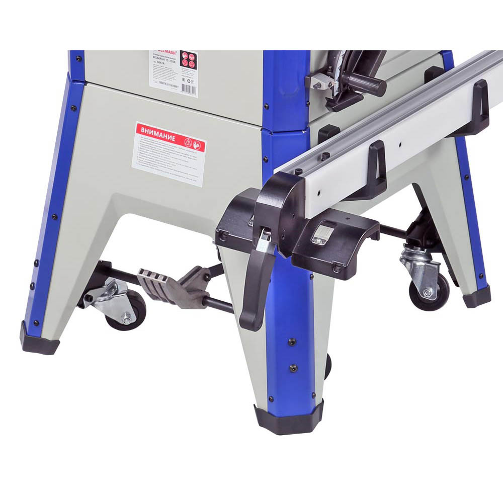 Модель оснащена асинхронным двигателем мощностью 2100 Вт и предназначена для работы дисками диаметром до 254 мм, с высотой пропила до 80 мм. Работает от сети 380 Вт. Рабочий стол и дополнительные секции выполнены из чугуна, что придает модели повышенную прочностью и износостойкость. Стол имеет два стандартных паза для установки углового упора или дополнительных приспособлений. Параллельный упор, выполненный из алюминиевого профиля с накладками из фторопласта, с надежным фиксатором положения на направляющих. Корпус изделия сварной, закрытый, изготовлен из листовой стали, имеет отверстие для установки патрубка для отвода стружки (Ø 100 мм), снабжен специальными держателями для хранения толкателя, углового упора, параллельного упора, ключа и пильных дисков. Механизм защиты от отброса заготовки позволяет безопасно распиливать заготовки.