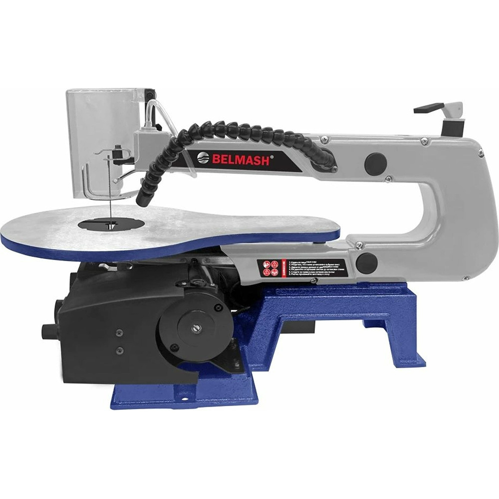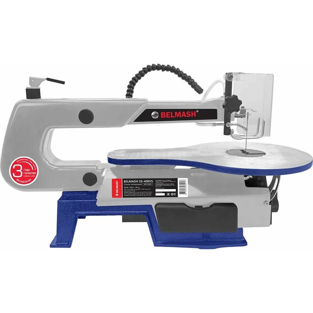 Станок лобзиковый БЕЛМАШ SS-400VS применяется в столярных мастерских, а также в ремонтных и строительных работах. Выполняет: криволинейную (фигурную) резку, резку под углом (снятие фаски), продольную и поперечную резку. На чугунной станине установлен алюминиевый рабочий стол (253x412мм), который имеет механизм угла наклона 0…+45 град. В качестве режущего инструмента используется пильное полотно длиной 133мм (со штифтом и без него). Просвет до рамы - 410мм. Максимальная высота заготовки - 45мм. Чистоту рабочего места обеспечивают система сдува пыли с линии реза и патрубок для подключения к системе аспирации.