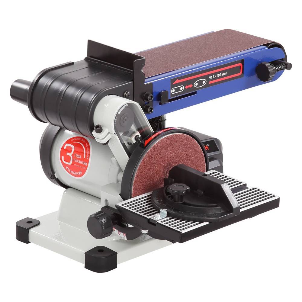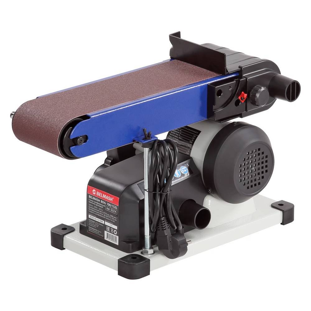 Станок шлифовальный ленточно-дисковый БЕЛМАШ BDG 100/152L позволяет шлифовать поверхность плоских заготовок с помощью ленточного узла и выравнивать углы и другие выпуклые поверхности при помощи диска. Корпус станка составной: сталь и пластик. Широкое основание с противоскользящими накладками обеспечивает устойчивость на поверхности и снижает вибрации. Благодаря отверстиям есть возможность крепления к верстаку. Ленточный блок поворотный, в зависимости от задач можно установить угол наклона от 0 до 90 град. Для удобства имеется рычаг быстрого натяжения и ослабления шлифовальной ленты. На дисковый шлифовальный узел установлен алюминиевый рабочий стол с П-образным пазом для углового упора. Угол наклона стола от 0 до 45 град. Рабочий стол съемный, в зависимости от потребности его можно переставить на ленточный шлифовальный узел, установленный в вертикальном положении. Для подключения систем аспирации имеются 2 патрубка, диаметры 35 и 31мм.