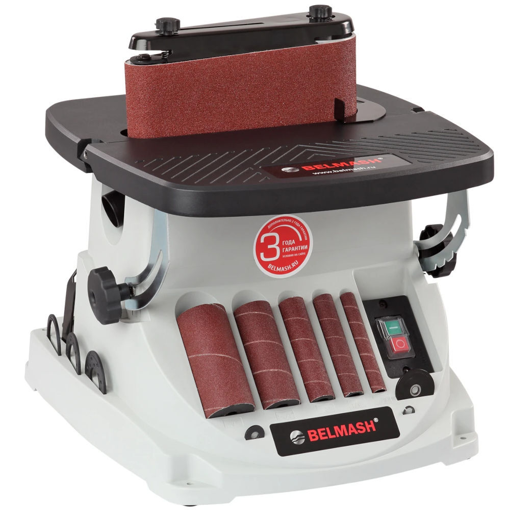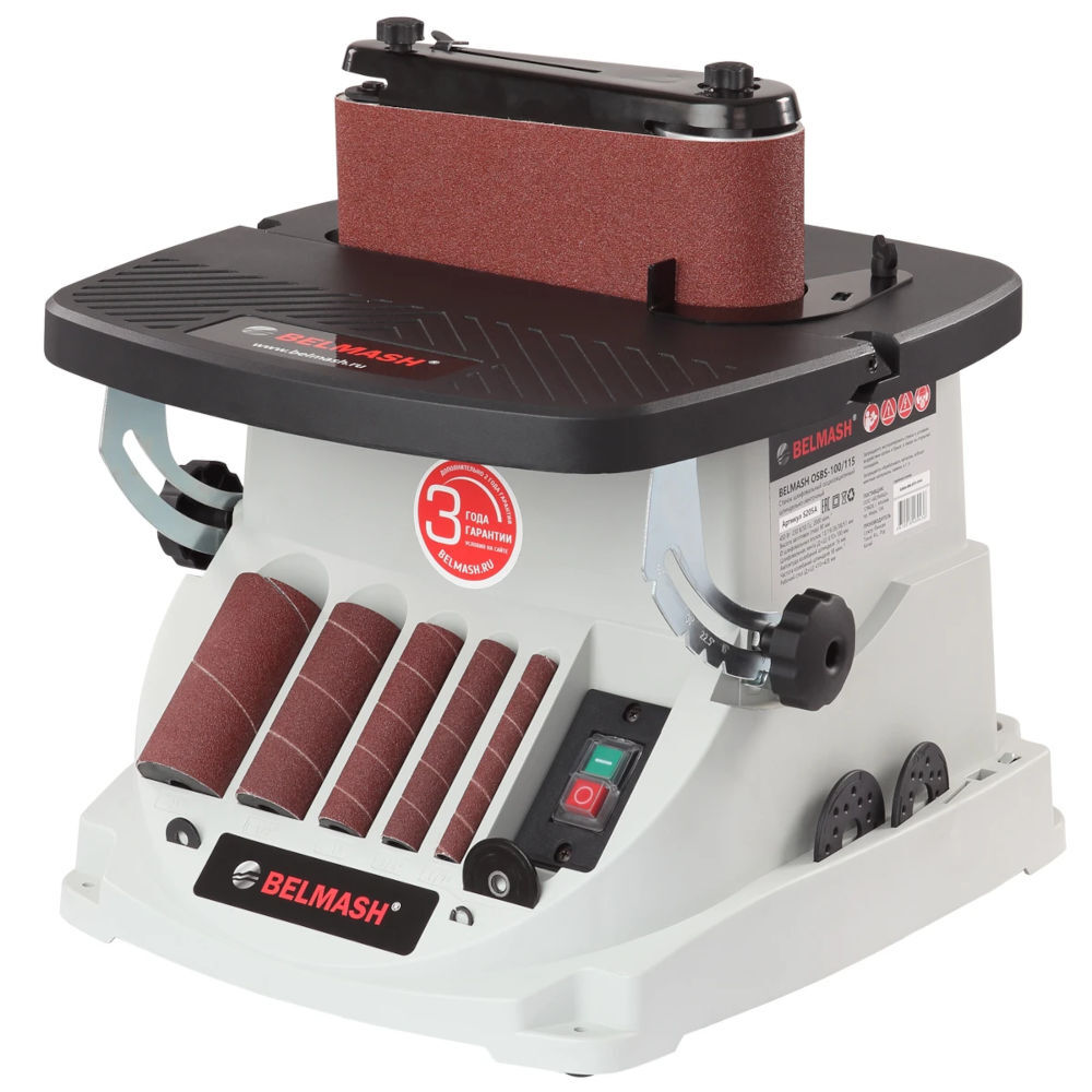 Станок шлифовальный осцилляционный шпиндельно-ленточный БЕЛМАШ OSBS-100/115 применяется в штучном и мелкосерийном деревообрабатывающем производстве. Станок предназначен для окончательной обработки шлифованием криволинейных и прямолинейных поверхностей, кромок и фасок деревянных заготовок путем вращательно-колебательных движений абразивной ленты или втулки. Комплектуется сразу двумя узлами, что позволяет выбрать более подходящий в зависимости от поставленной задачи. Шпиндельный узел оптимален для работы с кромками, торцами и краями заготовок с вогнутым профилем. В зависимости от кривизны обрабатываемой поверхности подбирают диаметр абразивной втулки (13, 19, 26, 38, 51 мм). Высокая эффективность при использовании оснастки с такой рабочей поверхностью достигается за счет осцилляции – вертикального перемещения вала – оно увеличивает линейную скорость абразива и предотвращает возникновение продольных царапин из-за дефектов оснастки. Ленточный узел имеет два обводных ролика разного диаметра, вокруг которых можно работать с вогнутыми поверхностями и прямой участок с металлической подложкой для плоских деталей из дерева. Движение ленты тоже происходит с осцилляцией, что повышает производительность и качество шлифования. Мощный коллекторный двигатель обеспечивает высокую частоту вращения шпинделя – 2000 об./мин. Рабочий стол состоит из двух секций из литого алюминия. Передняя секция регулируется по наклону, задняя – жестко закреплена. Фиксированные углы наклона поворотной секции стола 0/15/22,5/30/45 град. Высота шлифовального барабана 115мм. Максимальная высота заготовки 90мм. На корпусе станка имеются слоты для хранения всех принадлежностей из стандартного набора: барабанов, втулок, вкладышей, шайб и ленточного узла в сборе.